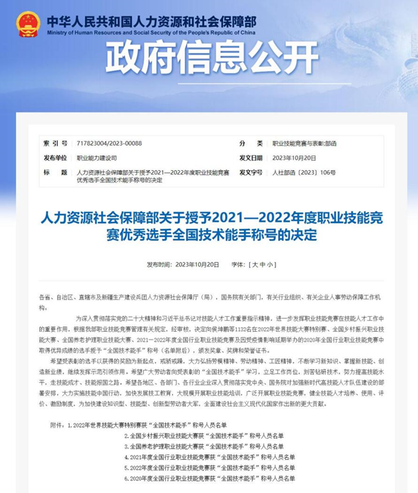 近日,人力资源社会保障部发布《关于授予2021—2022年度职业技能竞赛优秀选手全国技术能手称号的决定 》(人社部函〔2023〕106号),对在2021—2022年度全国行业职业技能竞赛及相关国家级赛事中取得优异成绩的选手授予“全国技术能手”称号,颁发奖章、奖牌和荣誉证书。其中,安防行业6名选手被授予“全国技术能手”称号。