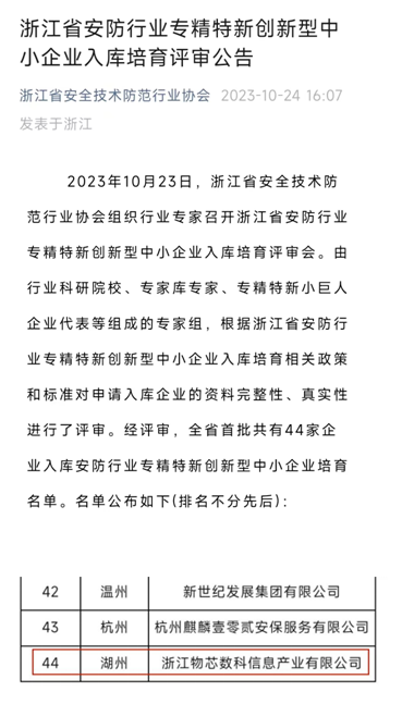 物芯数科入库浙江省安防行业专精特新创新型中小企业首批培育榜单