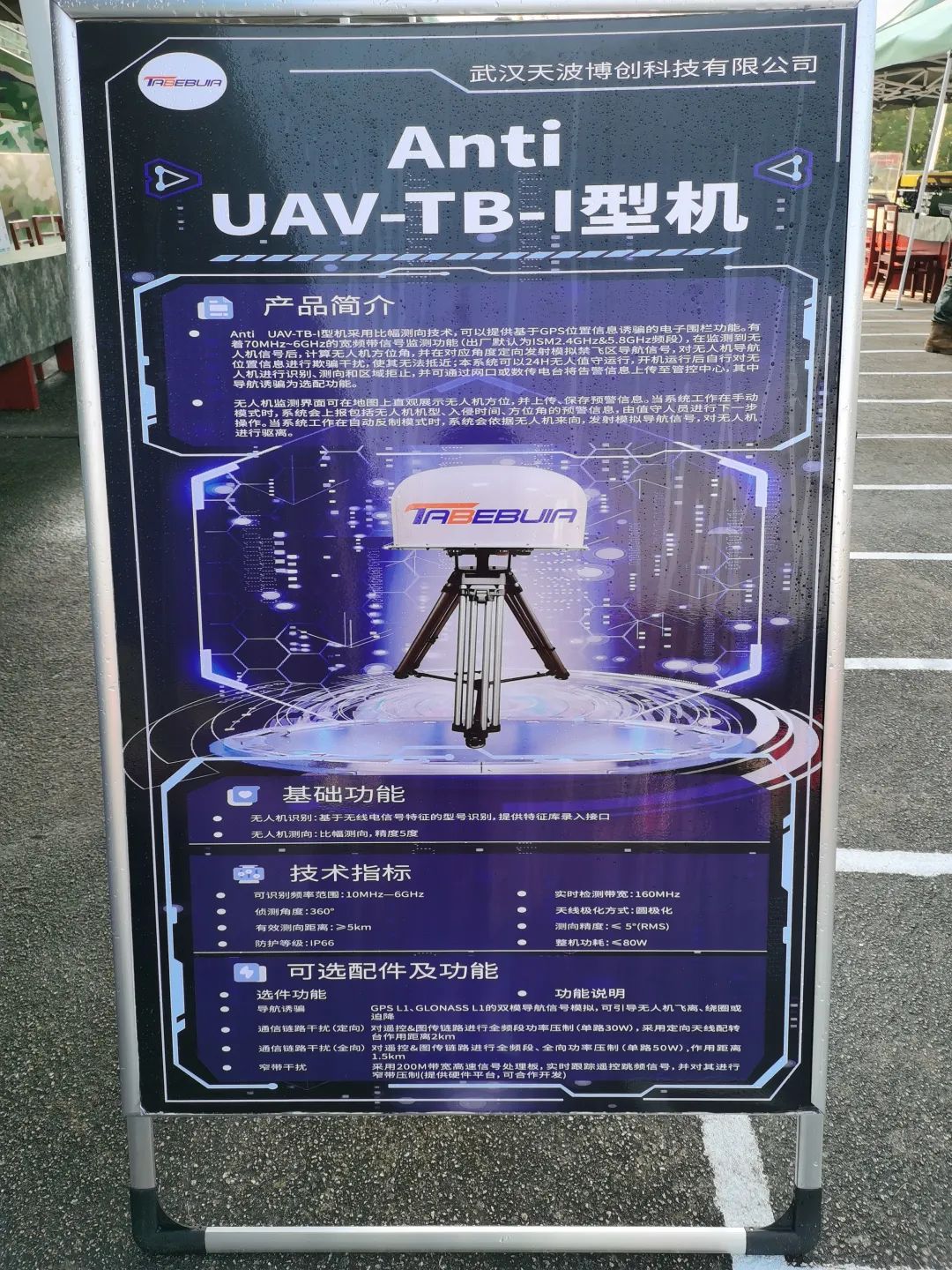 武汉天波博创Anti UAV-TB-I 型反无人机系统:采用比幅测向技术,可以提供基于GPS位置信息诱骗的电子围栏功能。有着70MHz~6GHz的宽频带信号监测功能(出厂默认为ISM2.4GHz&5.8GHz频段),在监测到无人机信号后,计算无人机方位角,并在对应角度定向发射模拟禁飞区导航信号,对无人机导航位置信息进行欺骗干扰,使其无法抵近;本系统可以24H无人值守运行,开机运行后自行对无人机进行识别、测向和区域拒止,并可通过网口或数传电台将告警信息上传至管控中心,其中导航诱骗为选配功能。