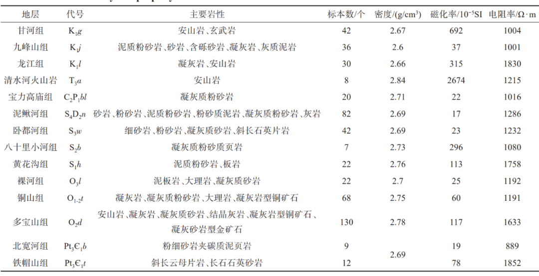 地质体的物性差异是引起重、磁、电异常的根本原因,掌握地质体的物性参数的特征及变化规律是做好重、磁、电资料地质解释工作的基础。依据1:20万区域地质图及1:5万研究区地质图,设计了5条采集路线,在多宝山矿集区内100余处露头区采集岩石物性标本共计974块,采集物性样品涉及地层近20个、侵入岩体11个。此外还收集了研究区内具有代表性的6口钻孔的岩芯样品260块。对所有样品进行了甄别和加工,分别在现场与室内进行了密度、磁化率、电阻率物性参数测定,分组进行了正态统计分析,统计结果示于表1至表4。表1 多宝山矿集区地层物性统计一览表