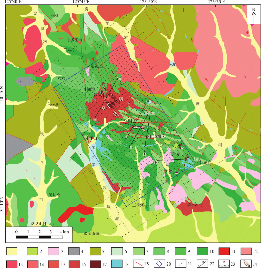 1—第四系;2—白垩系火山沉积岩;3—清水河组安山岩;4—石炭系—二叠系陆相沉积;5—志留系—泥盆系碎屑岩;6—奥陶系上统沉积地层铜山组浅海相沉积;8—多宝山组三段中酸性-酸性熔岩、火山碎屑岩;9—多宝山组二段中性火山岩、火山碎屑岩;10—多宝山组一段中性-中酸性火山碎屑岩;11—燕山期二长花岗岩;12—燕山期花岗闪长岩;13—印支期二长花岗岩;14—印支期花岗闪长岩;15—华力西期花岗闪长岩;16—加里东期花岗闪长岩;17—加里东期花岗闪长斑岩;18—闪长岩;19—实测断层;20—三维研究区;21—广域电磁点;22—分析剖面;23—验证钻孔;24—已知矿体