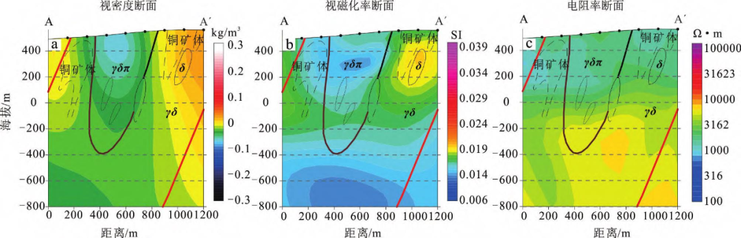 a.视密度断面;.视磁化率断面;c.电阻率断面