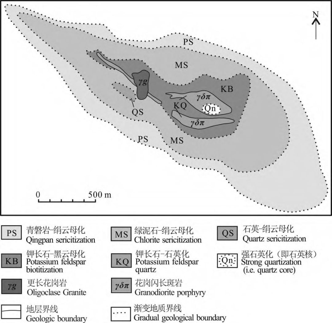 多宝山矿集区岩浆活动有火山喷发和岩浆侵入2种形式,岩浆岩分布较广,岩石类型复杂,从超基性岩到酸性岩均有分布。矿集区曾发生加里东期、华力西期、印支期、燕山期4期岩浆侵入活动,以加里东期和华力西期为主。侵入岩多发育在NW向和NE向断裂交汇处,以酸性、中酸性花岗岩类为主,其次为中性闪长岩类及少量的基性辉长岩侵入体。与铜矿成因关系密切的侵入岩是加里东中期花岗闪长岩与花岗闪长斑岩,它们组成复式岩体。多宝山斑岩型铜矿床的形成,与加里东期浅成相花岗闪长斑岩密切相关,并因海西期的岩浆活动进一步富集成超大型铜矿床,严挌受NW向构造的控制,而燕山运动时遭受改造。燕山期变形可分为2期:早期为陆内造山带发育及坍塌,构造线方向北东东;晚期为北东向断裂左行走滑。岩体中心部位比较厚,分枝多,形态复杂,北西延长方向上分枝少,形态规整,岩墙变薄,反映了岩浆是沿花岗闪长岩体的中心部位被动侵位的(赵元艺等,1997;杜琦等,1988)。斑岩型铜矿一般均存在明显的蚀变带,其蚀变组合及其分带模式俗称“大白菜模式”,由内到外依次为:石英内核-钾化带(黑云母-钾长石带)-似千枚岩化带(绢云母-石英带)-泥化带-青磐岩化带,斑岩型铜(钼)矿化往往分布在钾化硅化带外的绢英岩带(绢云母-石英带)中(叶天竺等,2017)。多宝山矿床具有典型的斑岩型铜矿床的蚀变分带特征,蚀变分带以花岗闪长斑岩体为核心,环绕着岩体呈北西向拉长的环带状分布,各带之间的界线不清,具有相互穿插、叠加现象,表现出多期次的蚀变特征,由内向外可划分为4个蚀变带:石英核、钾化带、绢云母化带、青磐岩化带(图2),多宝山铜(钼)矿的4个矿带均产于绢云母化带中(尹冰川等,1997;杜琦等,2008)。图2 多宝山铜矿床蚀变带分布示意图