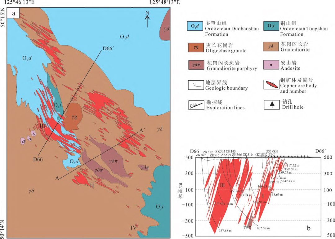 从多宝山矿区地质图(图3)可见大砬子斑岩体(花岗闪长斑岩)呈北西向展布,与构造走向一致,矿体环斑岩体分布。斑岩体的地表出露面积较小,仅0.17km2,延伸到100m标高时,面积为0.18km2,在深部,斑岩体则有明显膨大的趋势(赵元艺等,1997;杜琦等,1988),隐伏斑岩体的范围可能远比地表更大,如D66勘探线剖面图显示在地表斑岩体未出露,但在深部仍有斑岩岩枝分布(图3),推测有较大的斑岩体隐藏在深部。图3 多宝山矿区地质图(a)及D66勘探线剖面图