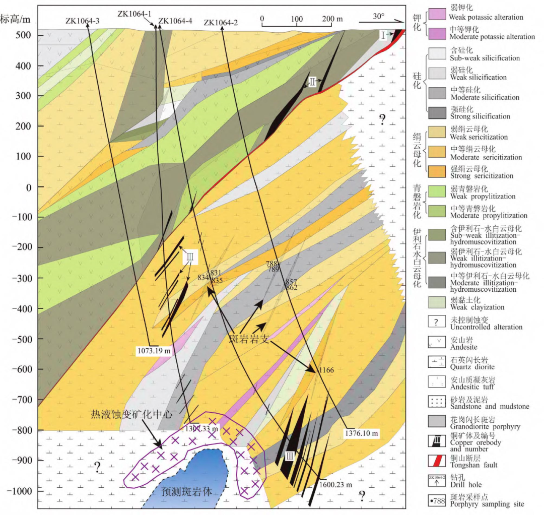 根据矿床地质、地球化学及地球化学异常特征可得出,多宝山矿床、铜山矿床的成因类型均为斑岩型,区别在于铜山矿床的斑岩体隐藏于深部(赵元艺,1995)。由于铜山地区成矿地质体并未揭露,那么深部肯定还存在隐伏成矿地质体,存在着较大的找矿空间(叶天竺等,2014)。杜琦(2008)认为,铜山断层将铜山矿床矿体的顶部推覆上来。矿田已揭露的几处大型矿体产状陡倾,延深稳定,由顶部向下有明显的变宽现象,推测断层下盘的矿体资源量较大。但铜山断层也使成矿后的矿体发生了截切和错动,导致矿化中心不明(金山岩等,2014;庞绪勇等,2017),给深部勘查带来了困难。王乐等(2017)根据铜山断层上、下盘蚀变带的类型、组合、强度对比分析,推测热液蚀变成矿中心与斑岩体顶部大致位于ZK1064-2钻孔正下方,垂直深度可能大于1400m,斑岩体向西倾(图8)。图8 铜山(T1064勘探线)推测斑岩体位置及热液蚀变矿化中心
