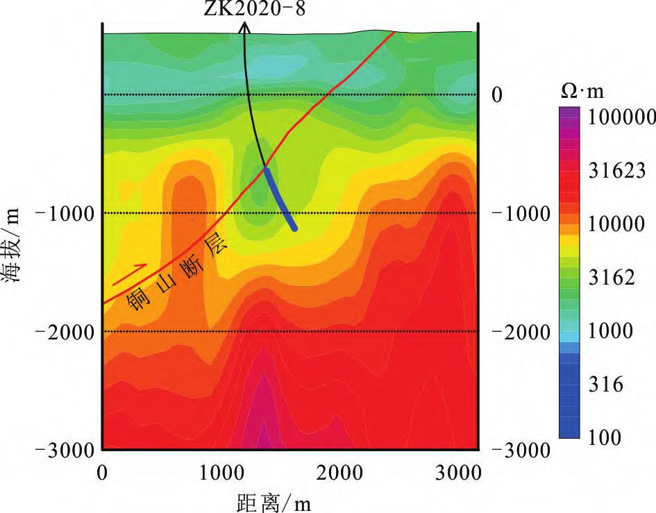 从图10中DD'线可以看到铜山矿区已揭露的矿体位于推测斑岩体的右侧(北侧),根据斑岩型矿床的矿化蚀变对称分布的特征来看,推测斑岩体左侧(南侧)显示的低阻异常信息很有可能为隐伏矿体。2020年,紫金矿业在铜山东南区域实施验证钻孔,该孔在孔深1150m处揭露到一厚度为2m左右的压扭性破碎带,其中可见厚20cm的断层泥,和地表及坑道中所见到的铜山断层特征相似,穿过断层后即开始见到铜矿化体,和物探解译推测的位置也较为吻合。据矿方反馈,验证孔所揭露的矿化体铜品位多在0.40%~1.0%之间,局部见强硅钾化、黄铜矿化蚀变,平均品位1.62%,穿矿厚度30m,单样品位最高4.33%。钻孔连续穿矿厚度600.16m,平均品位0.684%,且因井故未穿透矿体。目前,下盘矿矿体走向控制长度超过700m,最大垂深800m,水平厚度30~300m,控制以及推断的工业矿总资源量超过100万吨。从电法三维反演断面(FF'线)及钻孔轨迹图(图11)中可以看到,矿体所处部位来看位于铜山断层的下盘(铜山断层浅部由地表地质、矿区钻井控制,深部根据电法反演断面推断),矿体处于中高阻背景下的中低阻,该测线与DD'测线临近(位置见图1),电性特征(图11)也与DD'测线(图10)相似,其中低阻体为图11的DD'线中推测斑岩体左侧(南侧)中低阻的延伸,应为同一矿体。