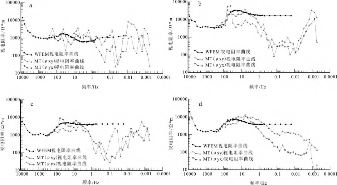 从地层物性统计来看(表1),地层从新到古表现为密度加大的变化趋势,反映了压实作用对密度变化的影响。由于各时代地层沉积岩性的不同,局部地层的密度有所变化,同时各地层的岩性、密度特征也反映了地层沉积环境的变化。古生界多宝山组、铜山组含有大量的火山岩成分,均具有较大的密度。从地层磁性的特点可以看出,正常沉积岩为主的地层普遍为弱磁性或是无磁性,含有火山岩成分的地层具有磁性,磁性最强的地层为清水河组及甘河组,其次为龙江组,这3个强磁性层均与火山岩有关,多宝山组也因含有火山岩成分表现为中等的磁性特征。在电性方面,分布在多宝山矿集区的各地层的电阻率普遍较高,电阻率的平均值均在1000Q•m以上,多宝山组比相邻地层具有较高的电阻率。表2为岩浆岩的物性统计,可以看出从基性到中性到酸性,密度逐渐降低,磁性变化较大,整体呈降低的趋势,电阻率具有逐渐升高的特征,整体为高阻。玄武岩和安山岩为高密度、中强磁性、中高电阻率;花岗闪长岩为中高密度、中磁性、高电阻率;花岗岩为中低密度、弱磁性、高电阻率。花岗闪长岩为本区的主要赋矿围岩,按照侵入的不同时期,对其物性进行了统计,见表3。从表3中可以看到加里东期和华力西期花岗闪长岩密度较为接近,密度都较高,达到2.75kg/m3,印支期和燕山期花岗闪长岩密度较低,分别为2.65kg/m3和2.69kg/m3;磁化率表现为时代越新,磁化率越大,可能与区内多期岩浆活动造成热液退磁有关;电阻率则大都表现为高阻特征。围岩经过矿化或蚀变后,岩石的物性均发生不同程度的变化(表4)。相比未蚀变的花岗闪长岩,蚀变、矿化的花岗闪长岩整体密度呈现增大的变化特征,推测为岩石在经过蚀变、矿化后,密度较大的金属矿物含量大量增加;在磁性方面,矿化蚀变的岩石磁性弱于未蚀变的花岗闪长岩,这一特征说明岩石在矿化及蚀变的过程中,温度较高的流体热液对岩石、矿石原有磁性起到了退磁作用;在电性方面,经过矿化、蚀变后的岩石、矿石,其导电性发生了显著的变化,蚀变后的岩石不同程度地表现为电阻率变低的特征。1990年—1992年,黑龙江省物探大队在多宝山地区开展了1:20万重力和1:20万航磁测量工作;1992年—1993年,地矿部遥感中心航测大队在多宝山地区完成了1:5万航磁;2013年中国地质科学院矿产资源研究所在多宝山矿集区进行了1:1万大比例尺低空航磁勘查,其精度为土4.0nT(杨生,2013)。2017年—2020年,中国地质调查局沈阳地质调查中心为了探索综合地球物理在解决矿集区3000m以浅深部透明化地质结构的作用及应用效果,在多宝山典型铜(金)矿集区选择了一面积为84km2的长方形重点区域作为试验区开展了 150m的广域电磁法、重力剖面,共采集广域电磁法坐标点4614个、重力点5048个。广域电磁法I级品率为95.6%,II级品率4.4%(赵理芳等,2020),重力总精度为±0.078x10-5m/s2。重力数据以2017年的高精度重力数据为主,外围采用1990年—1992年的重力数据作为扩边数据。磁力数据以2013年高精度航磁数据(比例尺1:1万)为主,外围以较低精度1990年—1993年航磁数据(比例尺1:5万、1:20万)作为扩边数据。重力高精度数据范围与三维广域电磁数据范围一致,而航磁高精度数据范围大于研究范围,为尽可能地减少边缘影响,还是对不同精度的重、磁数据进行了扩边拼合处理。为保证数据精度和可靠性,拼合数据时,2017年的高精度重力数据保持不变,通过Oasismontaj软件与外围数据进行Gridknit拼合处理。航磁数据通过Oasismontaj软件进行了Microleveling校正,并同样以高精度数据为准,对不同的数据进行了Gridknit拼合处理。广域电磁法(wide field electromagnetic method,简称WFEM)是中南大学何继善院士提出的(何继善,2010)。可在不限于“远区”的“广大区域”测量,颠覆了频率域电磁法只能在“远区”测量的思想,满足了“深地探测”战略3000m以浅矿产资源勘探技术的要求(何继善,2019)。本次广域电磁法数据采集频率段为8192~0.015625Hz,为了减少场源的影响,全区只在测区的西北方向布设了唯一场源,场源AB平行于测线方向(SW-NE)布设,长度为1km,收发距为30~11km。针对矿集区干扰源较多的问题,在矿集区进行了大地电磁测深(MT)和广域电磁(WFEM)采集试验,从采集的视电阻率曲线(图4a~d)可以看到,在厂房和采矿区附近干扰严重,而同点位的广域电磁(WFEM)点的数据质量明显优于大地电磁测深(MT)点。鉴于在多宝山矿集区广域电磁法数据能取得较高质量的数据,选择了在研究区施行三维广域电磁法。图4 多宝山矿集区MT点与WFEM点视电阻率曲线对比图