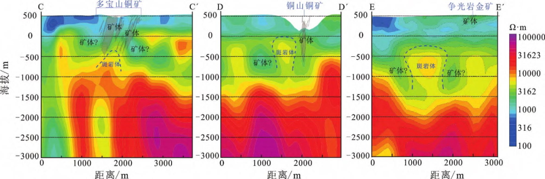 在多宝山、铜山、争光3个矿区的中深部都有与铜山斑岩体类似的电性异常特征(图10),即矿体对应着低阻、矿体之间为中高阻凸起,故可推测多宝山矿区、铜山矿区、争光矿区,均存在着隐伏的斑岩体,进一步证实了多宝山、铜山、争光属同一成矿系统——斑岩型铜矿系统。根据电性异常特征,中高阻(推测隐伏斑岩体)旁的中低阻(推测矿体)范围较广,故可判断多宝山铜矿外围可以扩大勘查,铜山铜矿矿体有进一步向下延伸的趋势,争光岩金矿在浅部为浅成低温热液型金矿床,多宝山组厚度较大,其下部有发现斑岩型铜矿的可能。由于早期的斑岩事件可能引起广泛的硫化作用,形成的溶液具有较高的溶解金和搬运大量Au(HS)2的能力,使其运移到浅部形成浅成低温热液型金矿床(陈革,1998)。铜山铜矿的上部围岩中发现了一定规模的金矿床,说明多宝山矿集区古生代构造岩浆活动带不但可以形成斑岩型铜矿床,还可以在铜矿上部形成热液型金矿床,形成“上金下铜(钼)”的成矿模式(谭成印等,2010)。矿集区北西端相对南东端剥蚀程度要高,成矿深度较浅的浅成低温热液型矿床很有可能已经被剥蚀(郝宇杰,2015)。在矿区典型的电性断面(图10)中还可以发现,虽然矿体在中深部都为中低阻特征,但在浅部(海拔500m以浅)矿体所处部位电阻率虽然仍低,但与浅部非矿部位比较,其电阻率相对较高,结合当地的地下水位高程为200~300m的情况(李文睿,2016),推测地表由于含水及风化影响,电阻率普遍降低,而矿化区域风化、含水对其影响相对更小,导致矿化区电阻率反而比围岩高。图10 典型矿区矿体、电阻率反演断面图及推测斑岩体