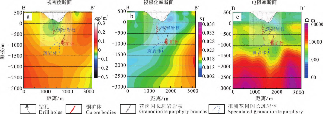 从铜山铜矿BB'剖面线(T1064勘探线两侧延长)重、磁、电三维反演剖面的异常特征图(图9a~c)看到,在斑岩岩枝往深部延伸的方向,处于低密度、弱磁化率、中高阻区。类似于多宝山155线(图7)花岗闪长斑岩边缘的矿化、蚀变造成周缘密度、磁化率升高、电阻率降低的特征,初步推测存在斑岩体及矿体。由于电法相对于重、磁在纵向上分辨率更高,故推测的斑岩体位置以电法为主。从多宝山矿区AA'重、磁、电异常特征(图7a~c)可知,斑岩体为中高阻特征,由于斑岩型矿床矿化蚀变带呈环状,根据岩石标本物性统计可知矿化蚀变使岩石电阻率显著降低,故形成了环绕中高阻斑岩体的中低阻矿化蚀变带,在BB'线电法反演断面中可以看到,推测的中高阻斑岩体两侧为低阻特征(图9a~c)。推测出的BB'线花岗闪长斑岩的位置,位于海拔-900m(深度1400m)左右,向西南倾,与王乐等(2017)预测的斑岩体位置和倾向(图9a~c)较为吻合。从物探上证实了铜山矿床深部存在较大的斑岩体,也佐证了铜山铜矿其成因类型为斑岩型矿床。图9 铜山(BB'线)剖面重、磁、电异常特征图