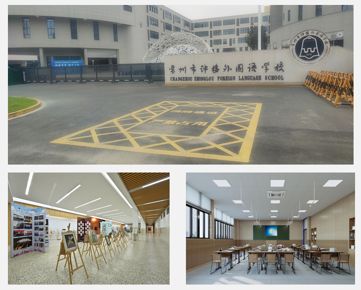 常州市钟楼外国语学校位于船舫南路以东、童子河南路以南、陈渡南路以西、朱夏墅路以北。学校总投资约5亿元,其中智能化专业投入1700万元,校园占地面积约107亩,地上校舍建筑面积5.7万平方米,全民健身中心建筑面积2万平方米,配备有地下智能接送系统建筑面积2万平方米。该校按小学48个班、初中36个班,实施小班化教学。