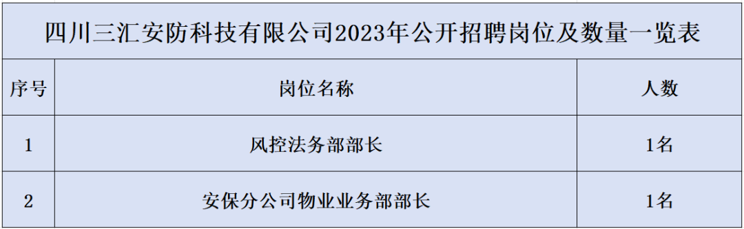 详见《四川三汇安防科技有限公司社会化公开招聘人才岗位需求表》(附件1)。