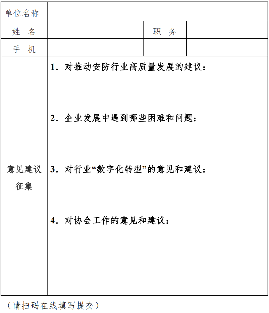 根据《章程》规定,协会拟于2024年1月召开中国安全防范产品行业协会六届四次理事会。为更好的推动行业高质量发展,聚焦行业的重点难点问题,有效开好本次理事会,协会向全体理事单位征集意见和建议,希望理事单位能及时准确反映诉求,并对协会的工作提出意见建议。我们将针对集中共性需求和存在的普遍性问题进行分析研判,制定精准服务的工作计划。协会将以高度的责任感和使命感,积极践行“四个服务”职能。