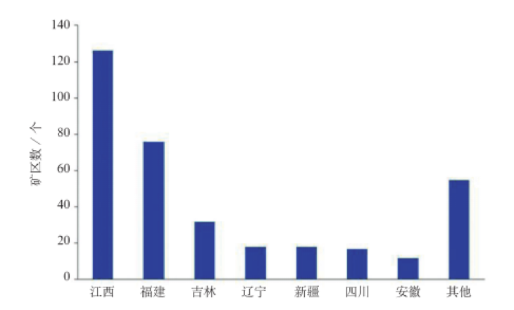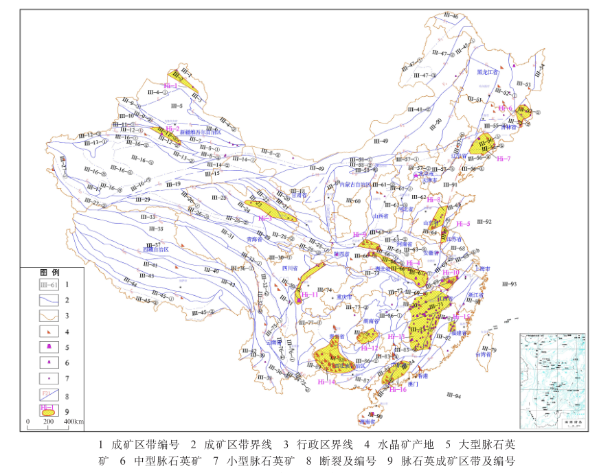 东西秦岭的丹凤-商南一带,发育在白云质灰岩、石英砂岩和燕山早期丹江钠长岩体中的脉石英成矿带。 桐柏-大别造山带南段的麻田-英山一带“灵虬山式”脉石英,脉体走向延伸数百米,厚度数十厘米至二十余米。 大别山东段的“白石山式”脉石英,主要分布在溪沸-菖蒲-田头及塘梨岩-灵山寨-团石湾共两条近北东向的成矿带,前带长约20km,宽约5km;后带长约12km,宽约4km。 苏鲁造山带南端的东海地区,脉石英主要沿南部、北部两条成矿带分布,南部成矿带长度25km、宽2.2km;北部成矿带长度41km、宽度小于6km。 苏鲁造山带南端的临沂中北部地区,岩浆热液型、变质热液型和伟晶岩型脉石英均有发现。 柴达木北缘的海西地区印支期花岗岩中广泛发育脉石英,脉体规模一般较大。