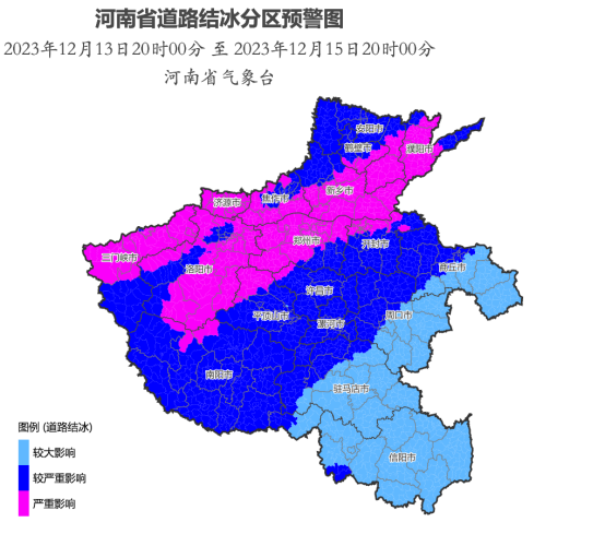 河南省气象台2023年12月13日16时继续发布道路结冰黄色预警:预计12月13日20时到15日20时,全省有降雪或雨夹雪,路表温度低于0℃,将出现对交通有较大影响的道路结冰,淮河以北大部影响较严重,其中黄河以北及三门峡、洛阳、郑州、开封北部、平顶山北部、南阳北部影响严重。请注意防范。