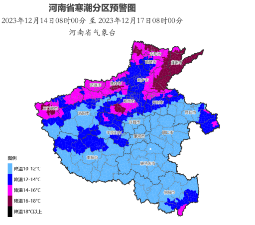 河南省气象台2023年12月13日16时升级发布寒潮黄色预警:预计17日早晨全省大部最低气温较14日早晨下降10度以上,黄河以北和三门峡、洛阳、郑州、开封、商丘北部和东部、许昌北部、平顶山、南阳北部、信阳南部部分县市下降12到16度,其中安阳北部和东部、濮阳、新乡东部、焦作南部、郑州西南部、三门峡西部局部下降16度以上。17日凌晨最低气温东部、南部零下9度到零下6度;其他县市零下12度到零下10度,其中西部、北部部分县市零下17度到零下15度,局部零下20度左右。14日,全省大部偏北风4到5级,阵风6到7级。15到16日,全省大部西北风5级左右,阵风7到8级,西部局部阵风10级左右。请注意防范。