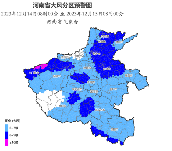 河南省气象台2023年12月13日16时发布大风蓝色预警:预计14日白天到夜里,全省大部偏北风4到5级,阵风6到7级,安阳、濮阳、鹤壁、新乡、郑州东部和西南部、开封、商丘西部、三门峡中北部、洛阳北部、平顶山北部和东南部、南阳东部、驻马店西部、信阳南部的部分县市阵风8到9级,三门峡北部局部10级或以上。请注意防范。上述地区的相邻县市(区)也需关注。