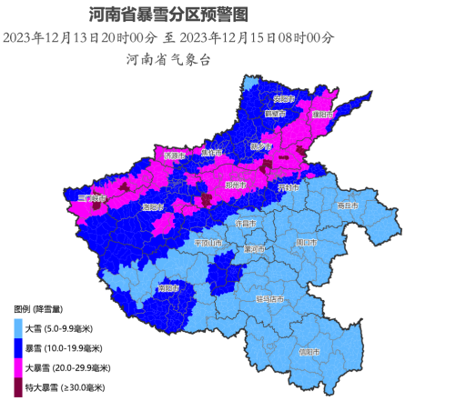 河南省气象台2023年12月13日16时发布暴雪橙色预警:预计13日20时到15日08时,全省有大雪,黄河以北和三门峡、洛阳、郑州、开封、许昌北部、平顶山北部和南部、南阳、驻马店西部部分县市将出现暴雪或大暴雪,其中新乡东部、郑州东北部和西南部、三门峡东部局部特大暴雪。受降雪影响,全省大部能见度较低。请注意防范。