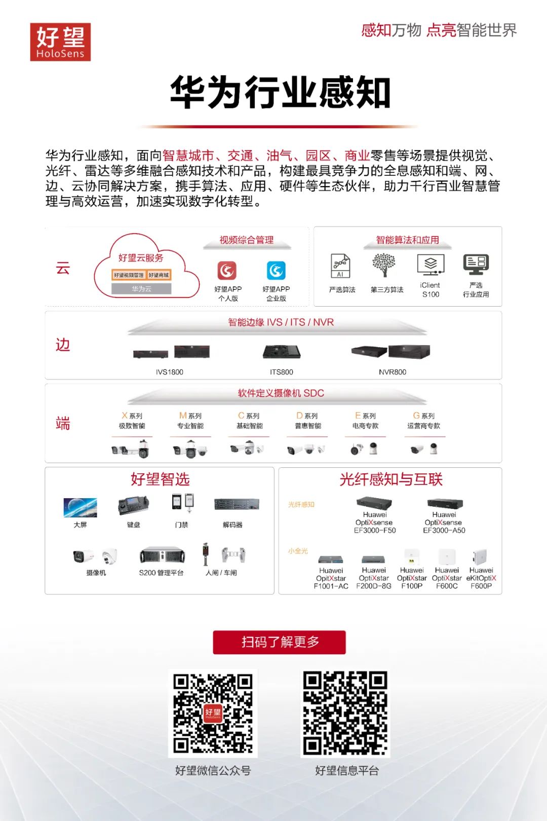 华为行业感知业务范围包括视觉感知、光纤感知和感知互联业务。视觉感知采用“好望”品牌,产品包括:软件定义摄像机(Software-Defined Camera,简称SDC),感知边缘(IVS,ITS和NVR),好望云服务(HoloSens Cloud Service)以及好望智选生态产品,构建以视觉为核心智能化方案,助力企业从智能安防走向智慧管理与智慧运营。