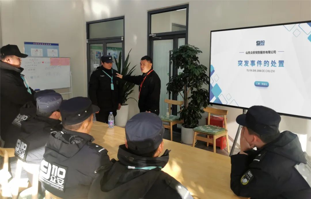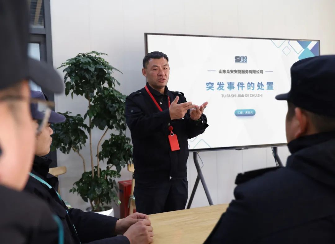 在泉意光罩光电科技(济南)有限公司岗点,培训讲师宋金元针对堵门、封路、人员推搡等保安员工作中可能遇到的实际情况,讲解了突发事件的处置方式。