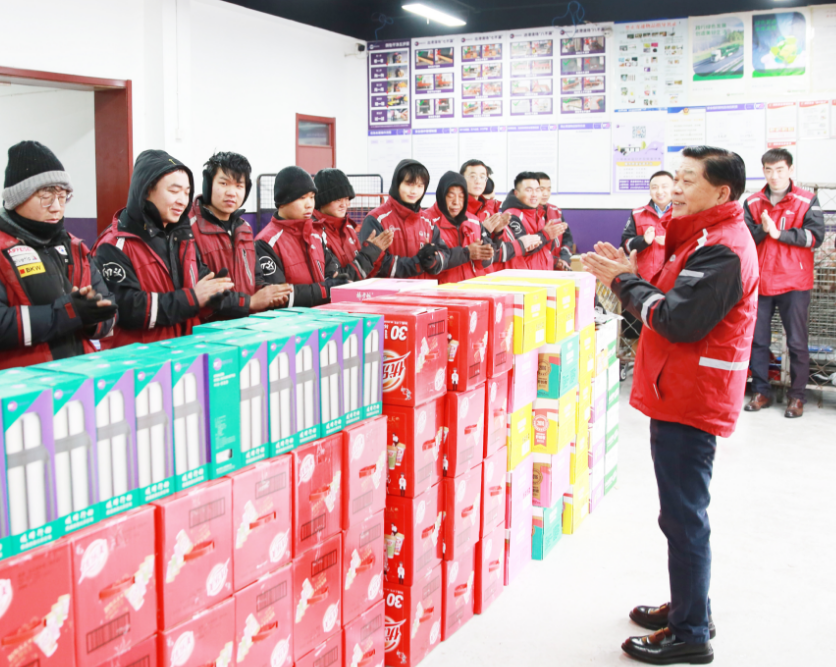 当日上午,喻渭蛟带队走访了北京市朝阳区国展、西坝河等多家分公司。每到一地,他实地查看快件操作环境、员工食宿等,并详细了解收派件及防寒保暖举措等,并向员工们一一送上保温杯、食品、保暖手套等用品。