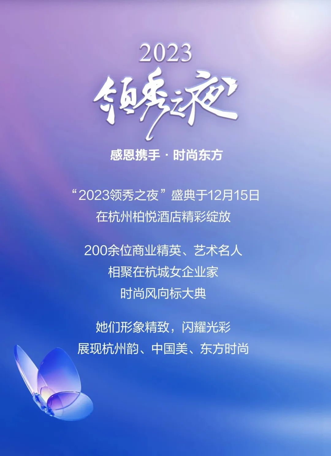伴随“2023领秀之夜”的璀璨启幕,面向未来,这个凝聚美丽产业的合作平台将坚持对美的向往与追求,继续东方传统文化与现代时尚融合的新方式,以内在的文化自信,展现新时代杭城企业女性的风姿,以东方美学为核心,续写关于美丽、时尚、智慧、梦想的新篇章。