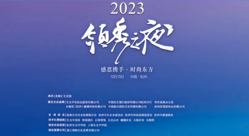 “2023领秀之夜”由7大品牌联合主办:毛戈平美妆、中国民生银行杭州分行、美黎汇、传世家族、长根堂、中商联合、岸景,由浙商女杰企业发展联合会、杭州市女企业家协会、杭州市休闲发展促进会、杭州市慈溪商会协办,美黎汇生活馆承办。