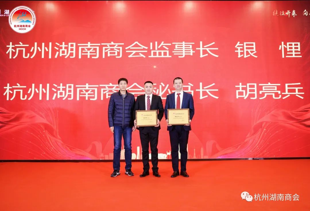 杭州市社会组织管理局副局长孙海鹏为第六届监事长银悝、秘书长胡亮兵授牌。