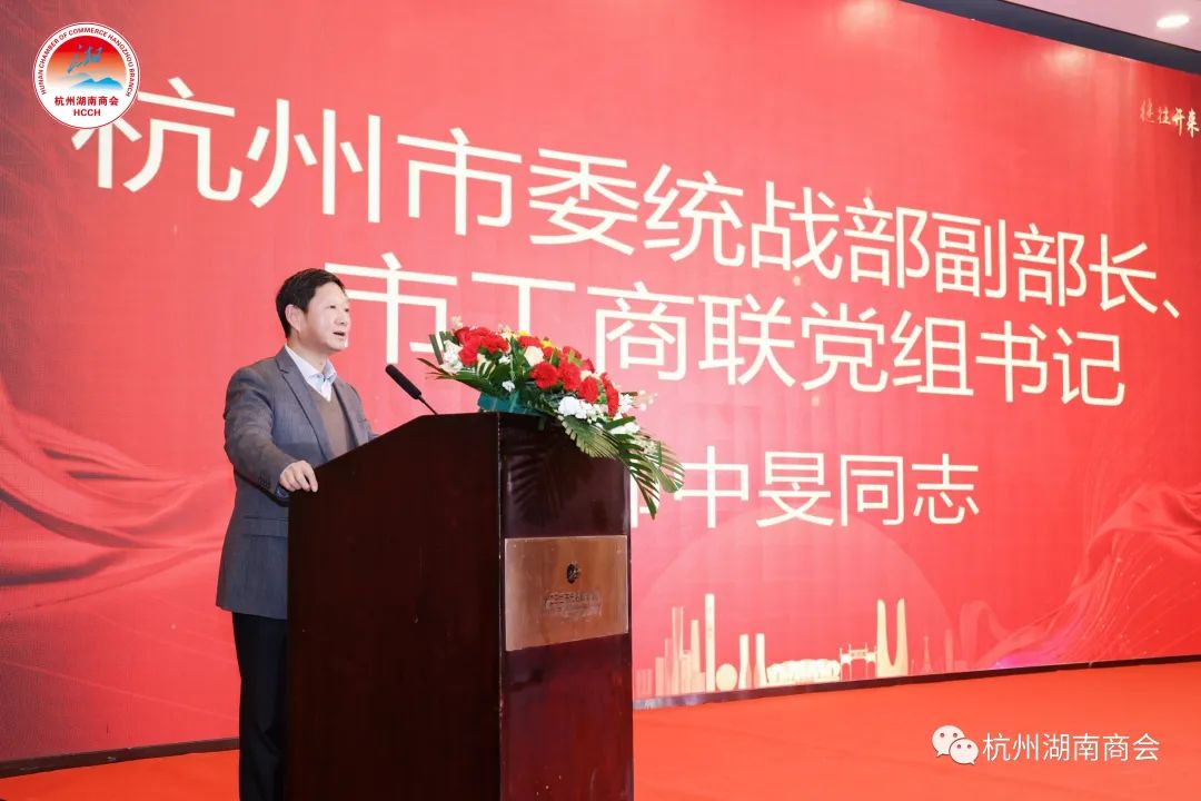 杭州市委统战部副部长、市工商联党组书记仰中旻为第六届会长姜程钟授牌。