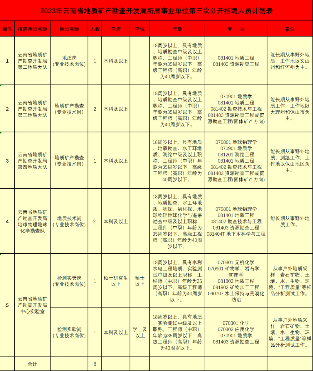 以上五家单位共公开招聘工作人员8名。具体招聘岗位及招聘条件,详见《2023年云南省地矿局所属事业单位第三次公开招聘人员计划表》(附件1)。