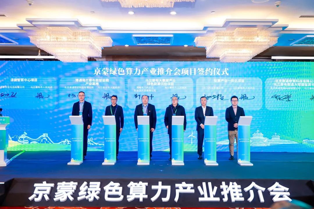 在大会签约环节,乌兰察布市与北京市经信局签署了京蒙“三绿”战略合作备忘录,并与清微智能、博通世达、国电电力、合芯科技、数道智算科技、世纪互联、中联云港等7家企业举行了算力产业项目签约仪式,签约总金额达214.5亿元会上。北京清微智能科技有限公司执行总裁邱召强、副总经理高坤等受邀出席签约仪式。