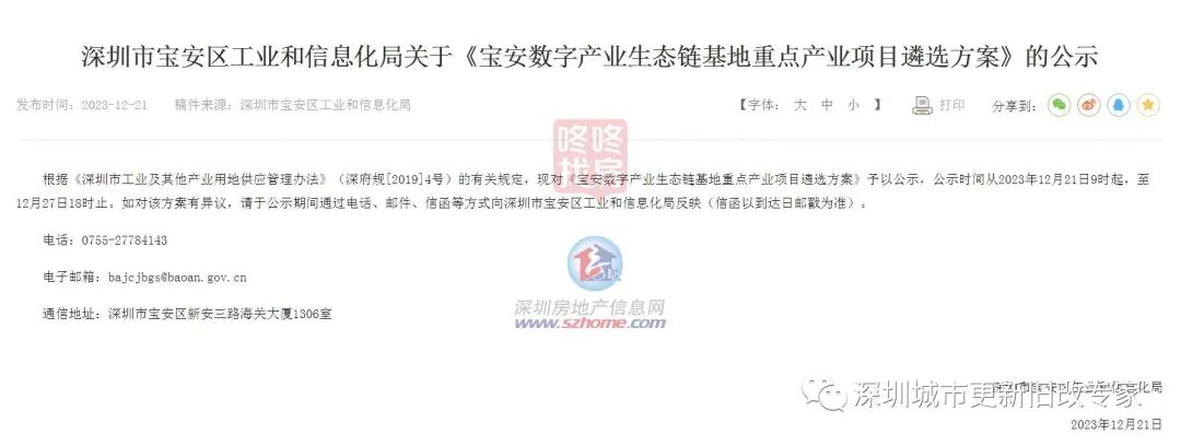深圳市宝安区工业和信息化局发布关于《宝安数字产业生态链基地重点产业项目遴选方案》的公示。