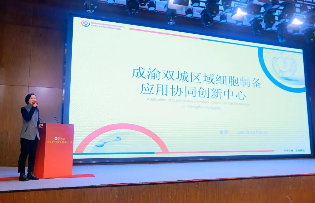 成渝双城细胞中心代表 黄英在会上作了主旨演讲。围绕中心当前开展的研究以及干细胞技术、免疫细胞等相关知识进行了分享。