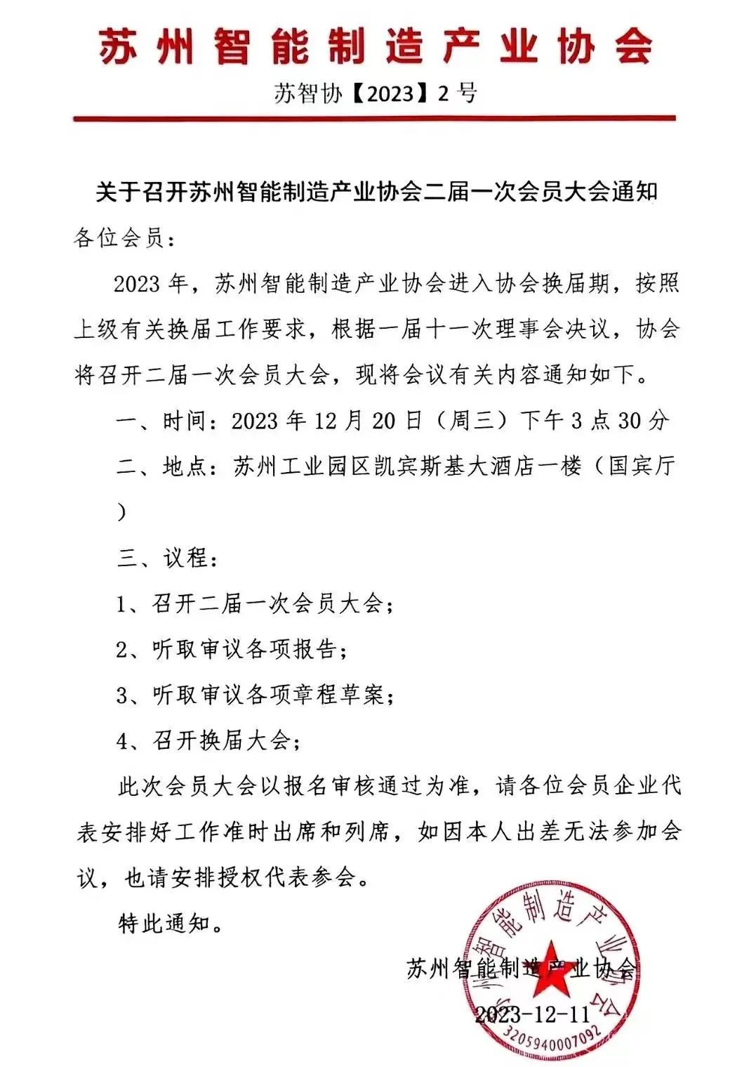 12月20日,苏州智能制造产业协会二届一次会员大会盛大召开。在这个重要的日子里,创智鑫荣幸地受邀参加此次盛会。此次会议汇聚了众多业界精英,共同探讨智能制造产业的未来发展。董事长徐长春受邀出席,不仅展现了创智鑫在智能制造领域的卓越实力,也为创智鑫教育与业界交流搭建了重要的桥梁。