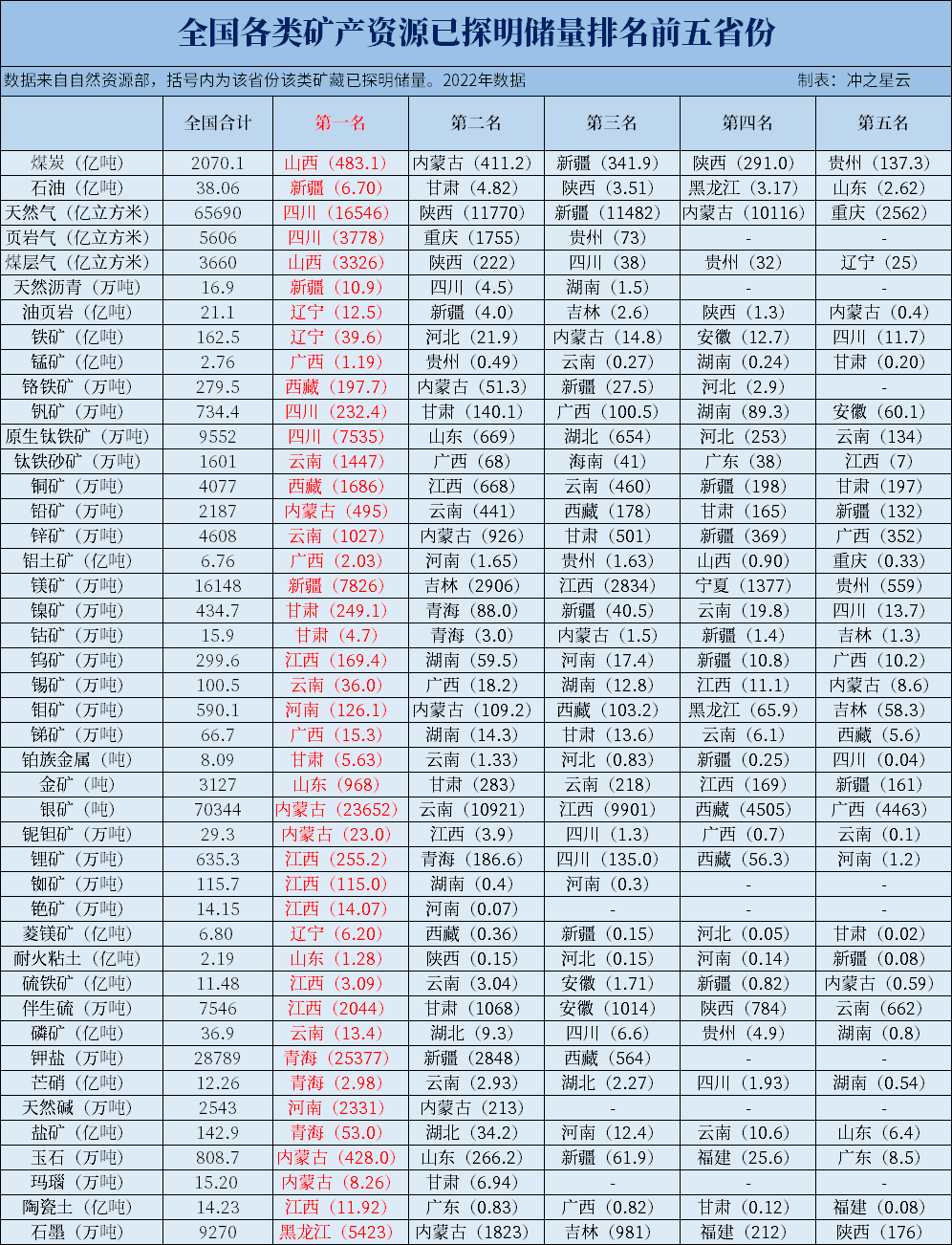 其实,我们可以发现,表格中绝大多数省份都是印象中发展水平普通,需要依靠转移支付的中西部省份。但是,一列列的矿产资源数据也告诉我们,不同省份只是分工有区别而已,中西部省份为国家做出的贡献,是不可磨灭的。