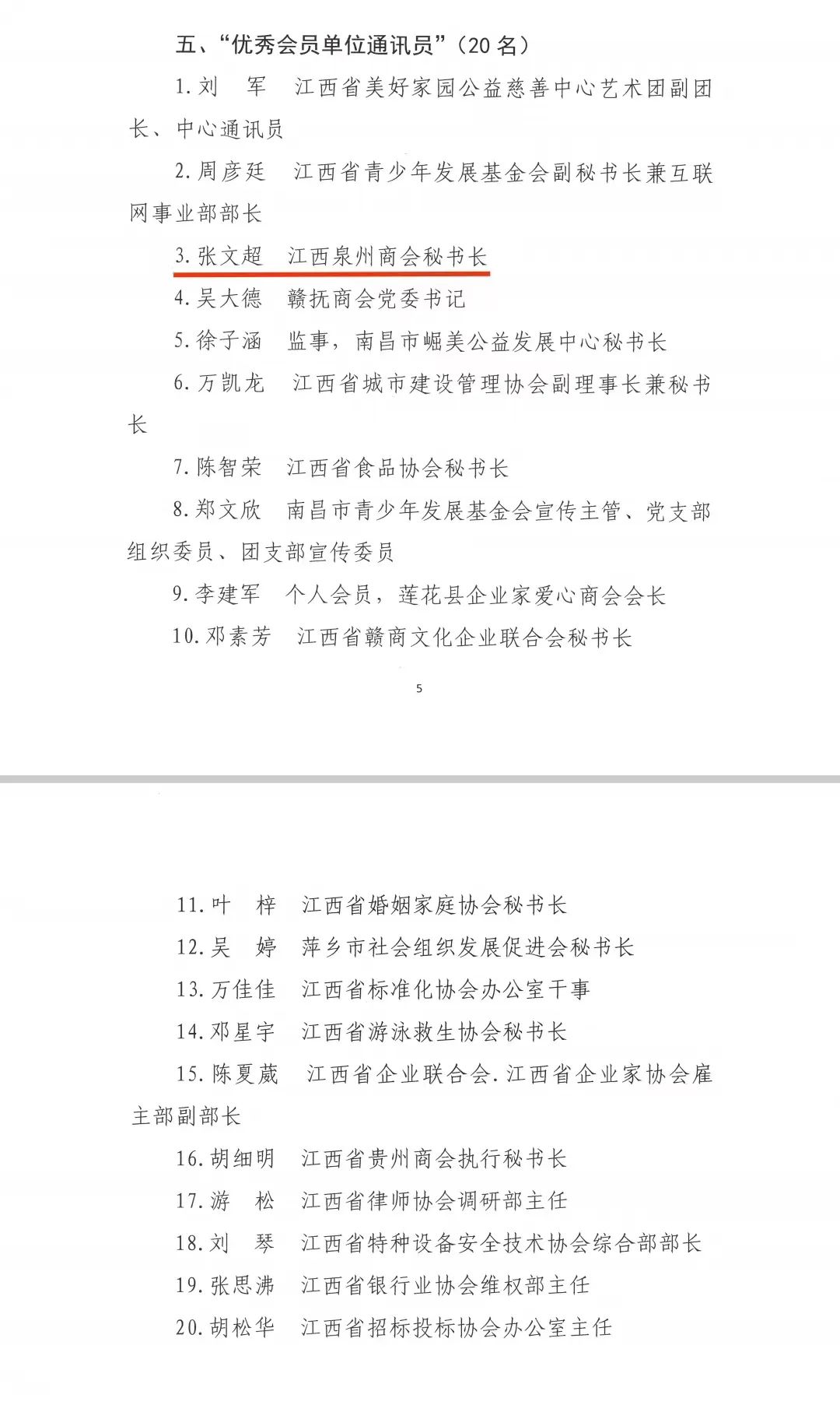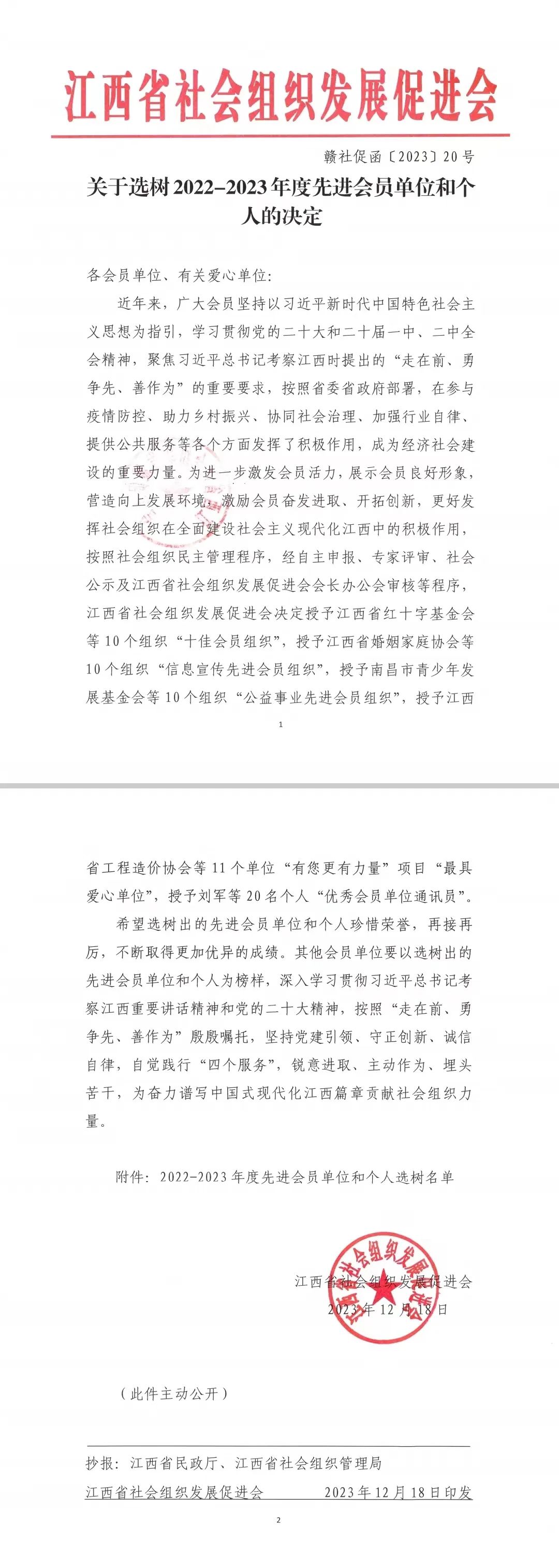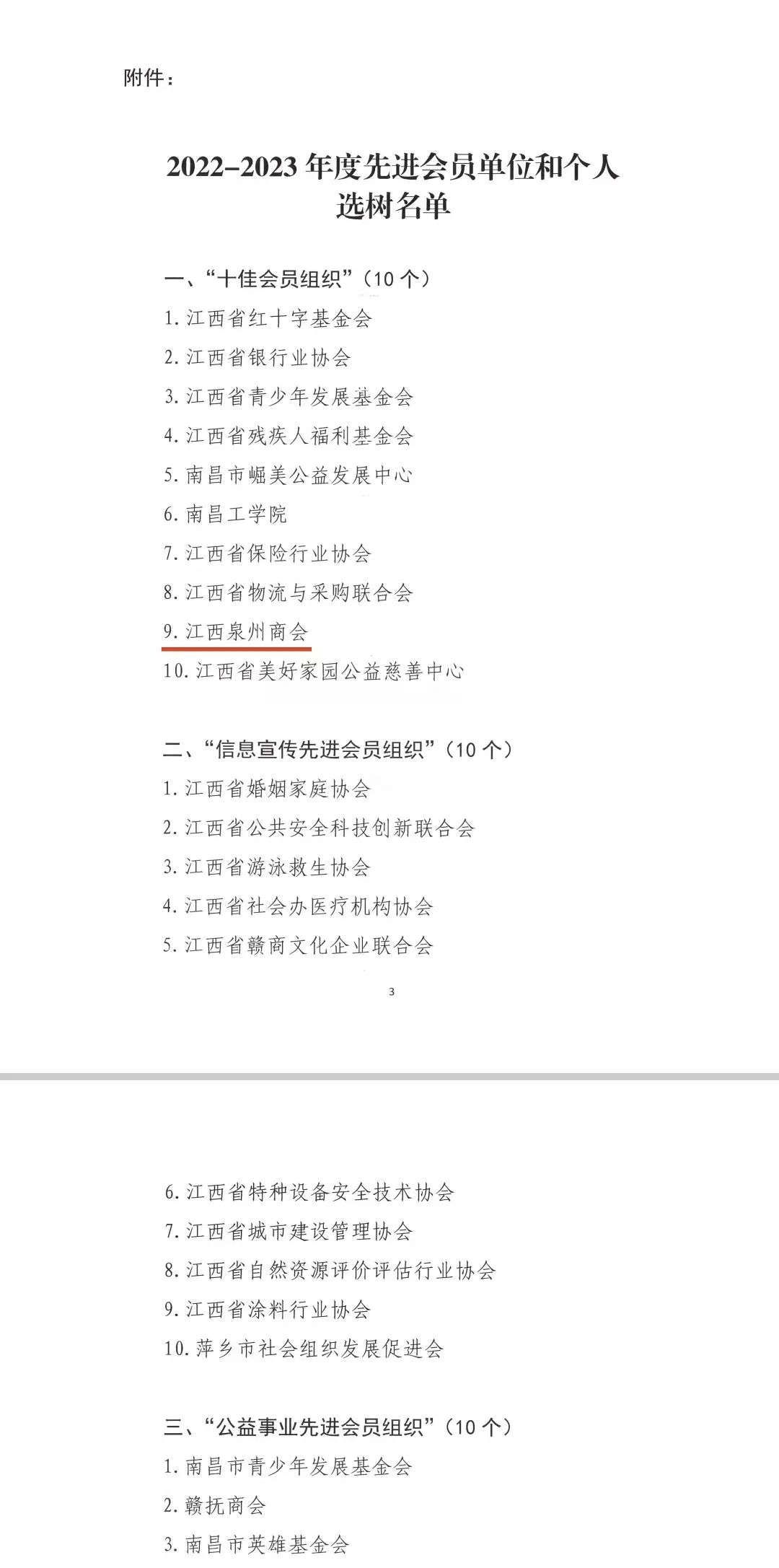 2023年12月18日,江西省社会组织发展促进会下发“赣社促函[2023]20号”文《关于选树2022-2023年度先进会员单位和个人的决定》,江西泉州商会被评为“十佳会员组织”;商会秘书长张文超被评为“优秀会员单位通讯员”。