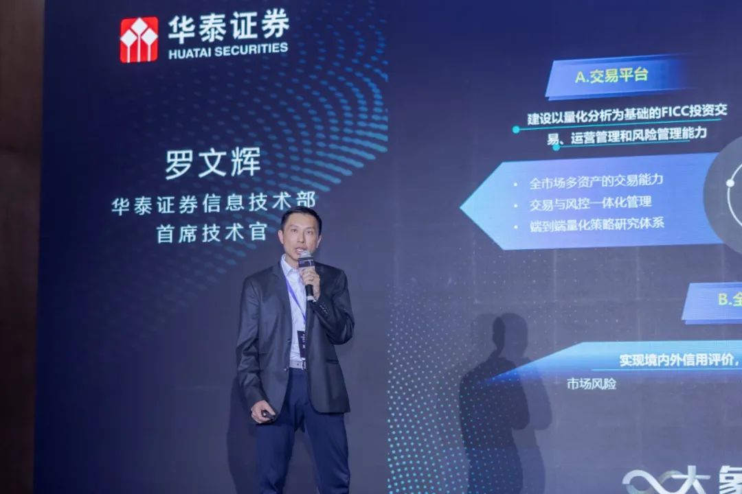 华泰证券信息技术部首席技术官罗文辉为与会嘉宾展示了FICC大象平台的最新建设成果。FICC大象平台作为国内领先的FICC多资产实时定价、做市和风险对冲平台,全面赋能华泰证券做市业务数字化发展,驱动华泰证券FICC电子交易做市能力接轨国际先进水平,业务规模不断增长。华泰资管公司首席信息官张艳以华泰资管云平台为切入点,介绍了华泰资管通过业务平台化、一体化建设赋能投资资管、投行资管两大业务赛道,助力资管业务守正创新的最新实践。华泰证券信息技术部数据科学研发中心联席负责人王鞅结合不同金融业务和管理场景,多视角展现了华泰证券应用大模型的尝试与探索,并针对大模型给行业带来的变革和机会点,与在场嘉宾交换思考与见解。
