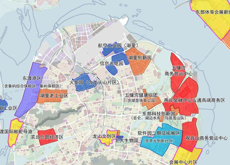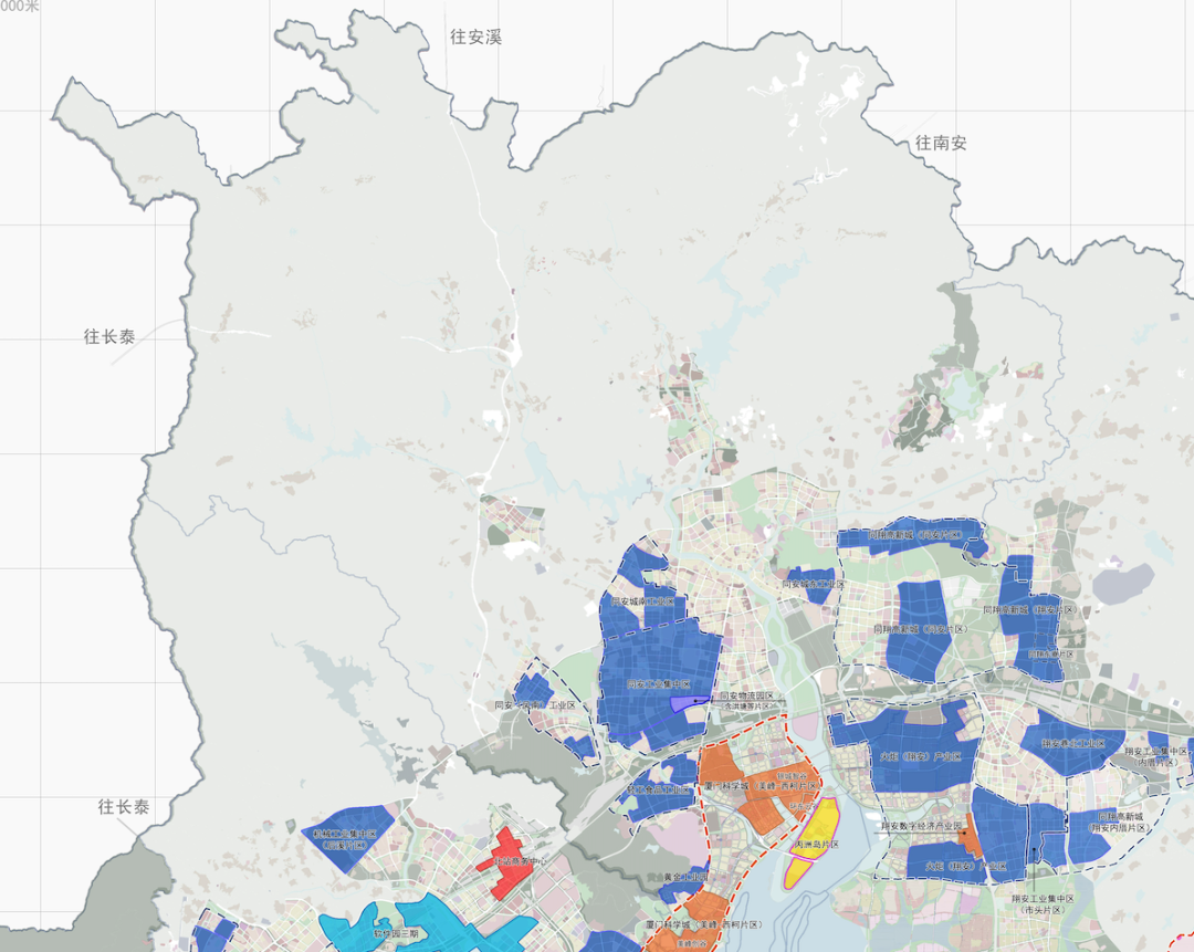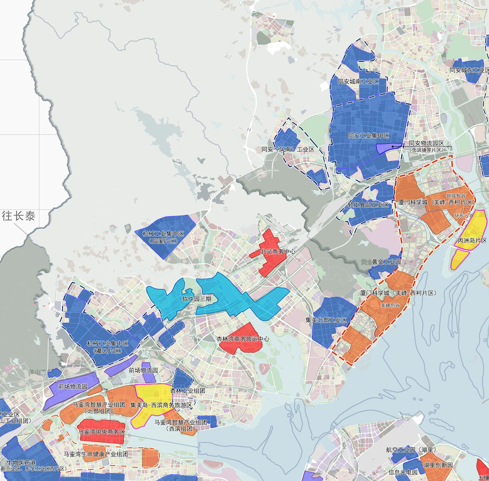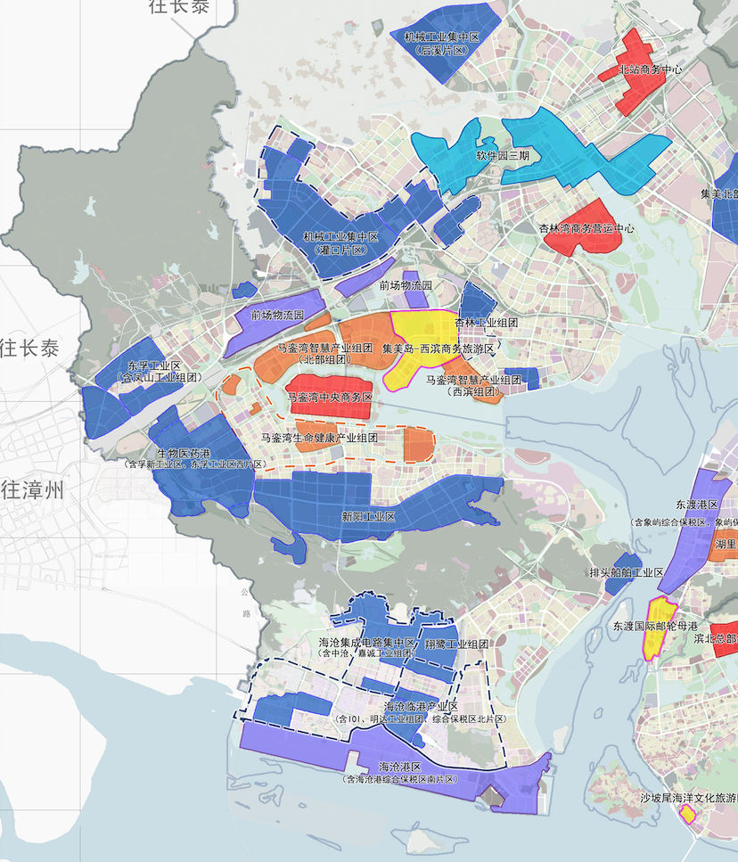 湖里区产业园区比较丰富,6种色块都有,而且布局比较均衡。
