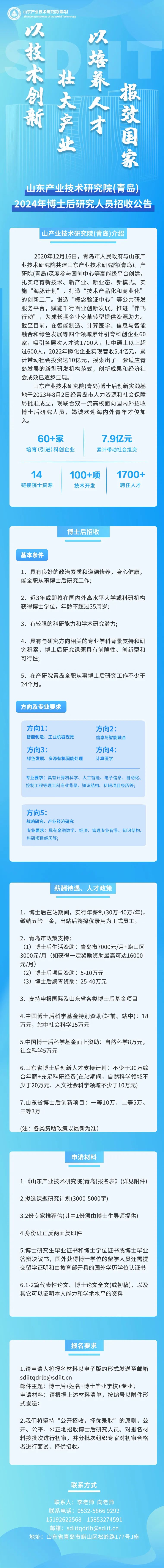 正在报名!山东产业技术研究院(青岛)2024年博士后研究人员招收公告