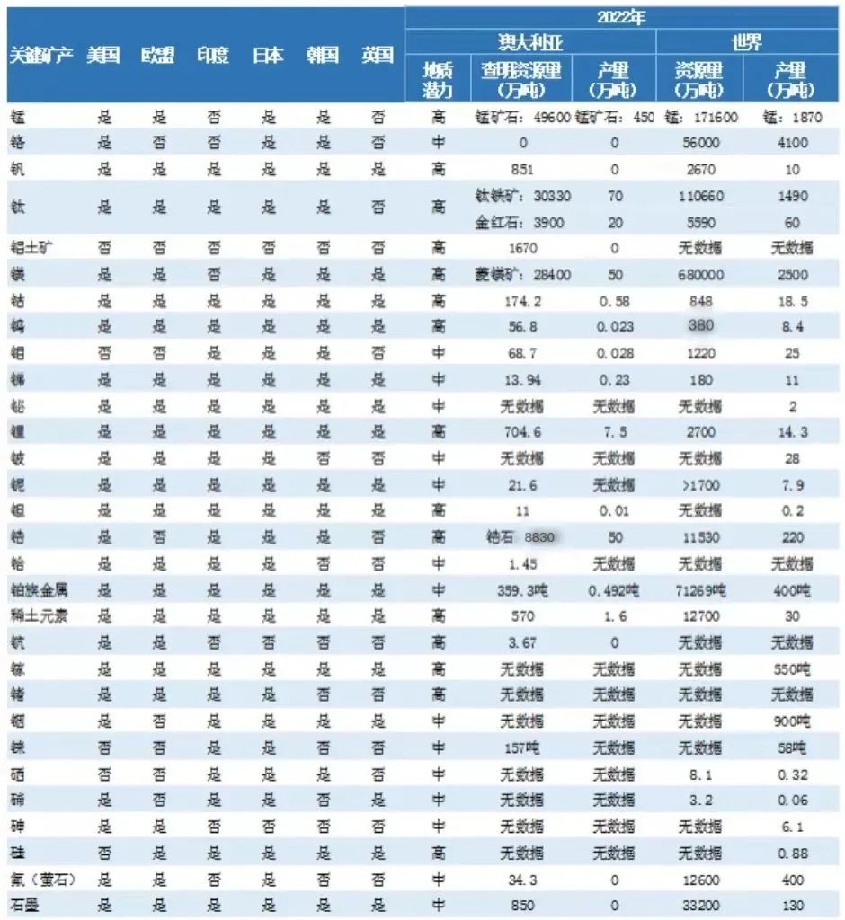 今年6月,澳大利亚政府扩大了关键矿产清单,12月16日,又对其进行了更新。在最新的公告中,澳大利亚政府将这两份清单定位为“对澳大利亚现代技术、经济和国家安全具有重要意义的矿产清单。”