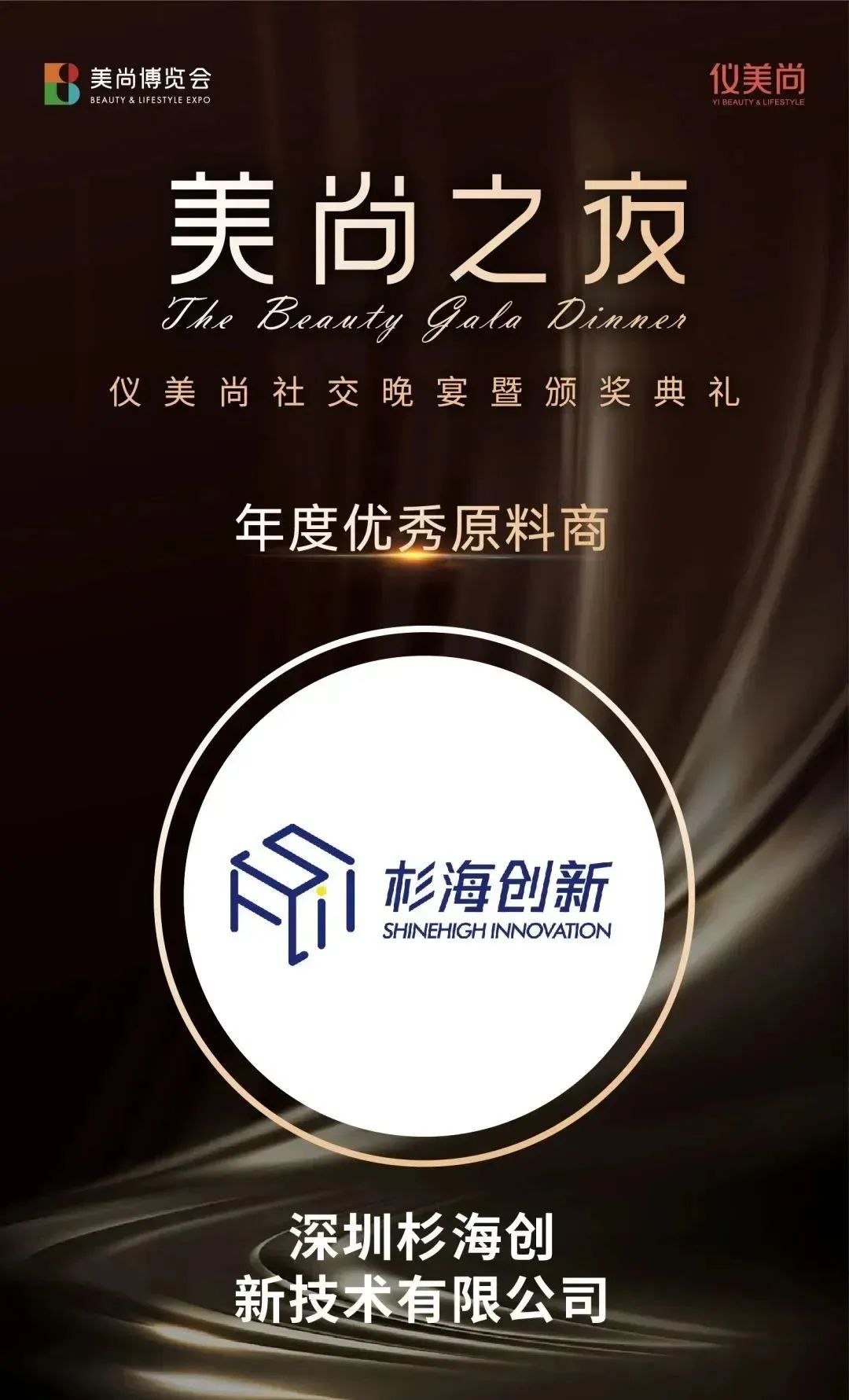 在“美尚之夜·仪美尚高端社交晚宴暨颁奖典礼”上,杉海创新凭借其在原料技术研发上的坚持与突破,荣获「年度优秀原料商奖」。这一奖项是对杉海创新在原料技术研发上不懈创新和持续努力的肯定,也是对我们在推动美妆产业升级,促进国货崛起中所作贡献的认可。我们将珍视这份荣誉,作为不断前行和超越的动力。