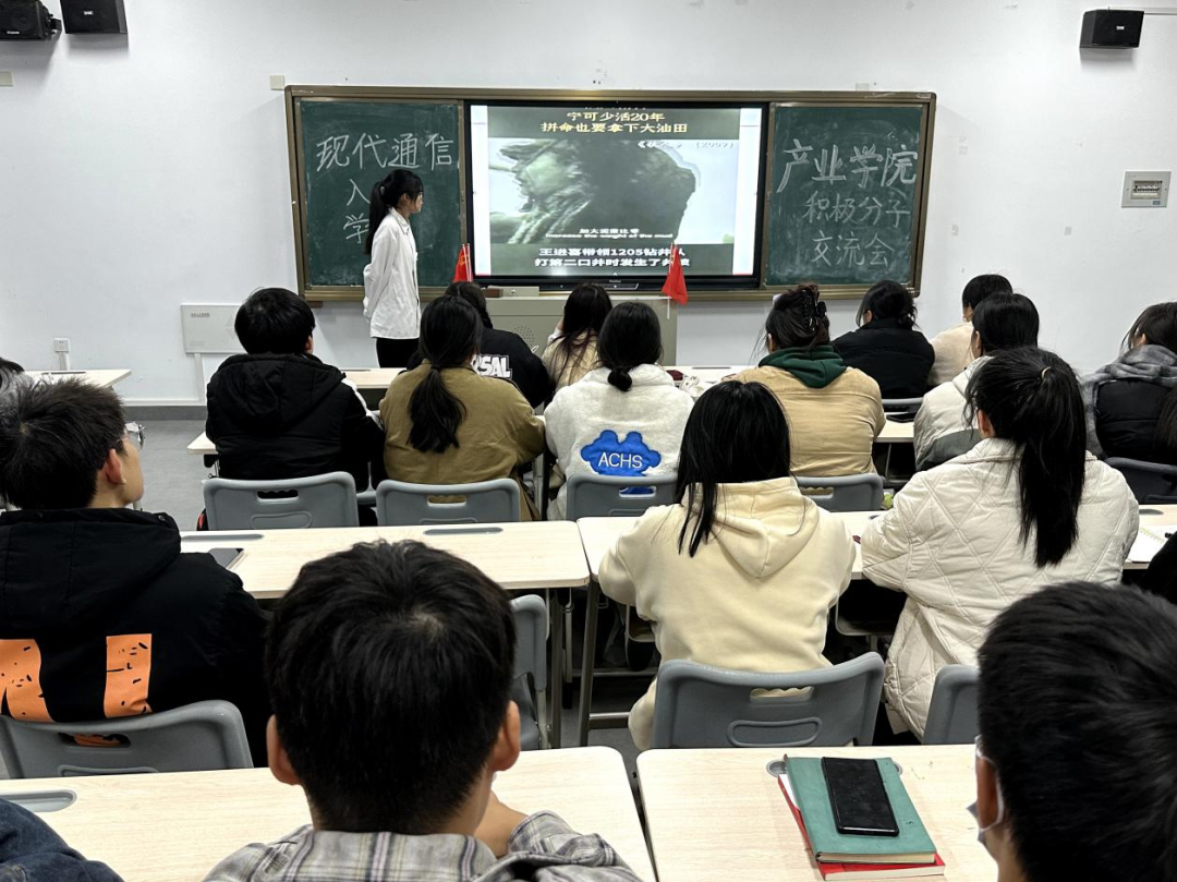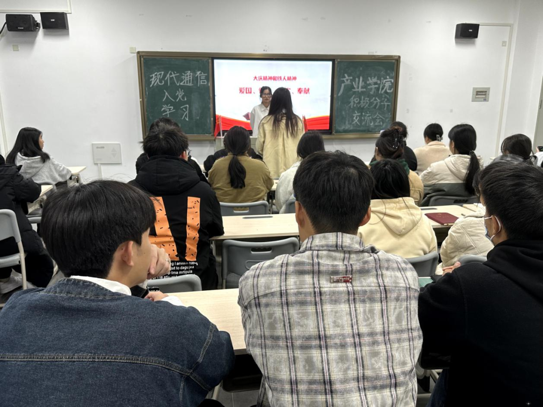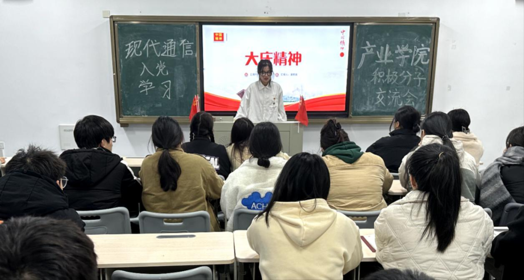 为深入学习贯彻习近平新时代中国特色社会主义思想和党的二十大精神,进一步深化党史学习教育,践行我院四色工程品牌建设,继承和发扬伟大的建党精神,充分发挥信仰之红的精神力量。12月21日晚20时,现代通信产业学院学生党支部在教学楼A607开展入党积极分子分享交流会之“大庆精神”主题学习会活动,22级现代移动技术1班潘楚苗同学为本期学习会主讲人,全体入党积极分子参与本次学习会。