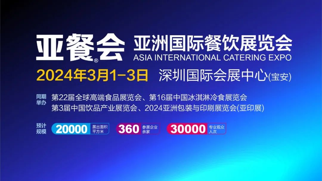 2024年3月1-3日,首届亚洲国际餐饮展览会,将与第22届全球高端食品展览会、第16届中国冰淇淋冷食展览会、第3届中国饮品产业展览会、第2届亚洲包装与印刷展览会(亚印展)等,在深圳国际会展中心(宝安新馆)同期举办。作为2024开年首场特大型食品与餐饮展览会,总展出面积预计15万平米、参展企业2200余家,预计专业观众 18万人次。