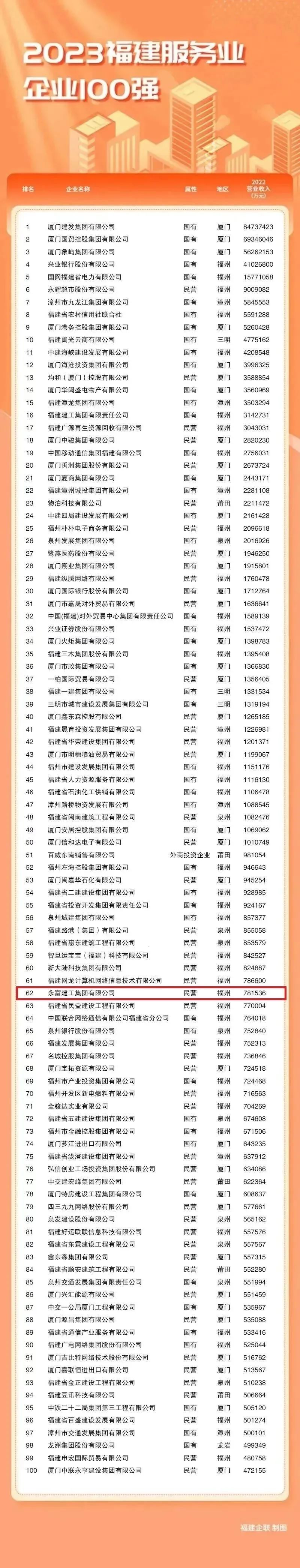 12月19日,2023福建企业100强发布大会在三明召开。会上发布了2023福建企业100强、福建制造业企业100强、福建服务业企业100强、福建战略性新兴产业企业100强四个榜单。福建省畲家企业商会执行会长雷春娟企业——永富建工集团有限公司荣登“2023福建服务业企业100强”。