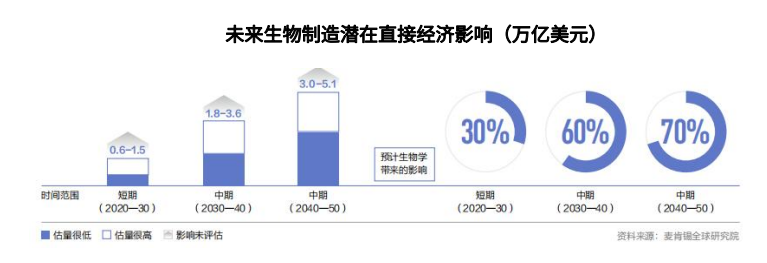 麦肯锡报告数据显示,全球经济中60%的产品可以通过生物方式生产,其中1/3是生物原料的产品,剩余的2/3也可以使用生物制造技术来生产或替代,未来 10-20 年,可应用于约400多个应用场景,预计可能对全球每年产生 2-4 万亿美元的直接经济影响。