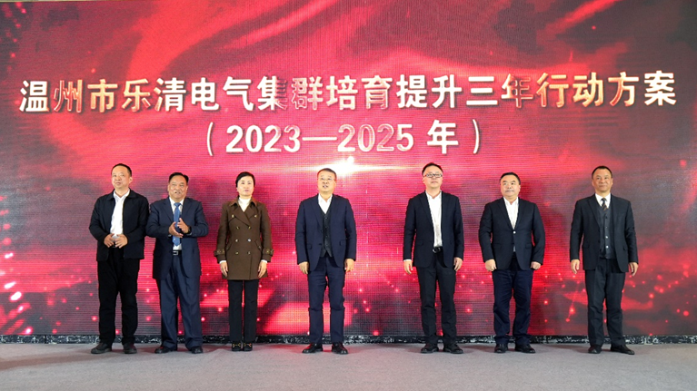 接着,温州市副市长王振勇,温州市委统战部副部长、市工商联书记钱素文,乐清市人民政府市长戴旭强,乐清市委常委、统战部部长郑巨化,乐清市委常委、柳市镇党委书记王烨,乐清市委常委、副市长叶序锋,商会会长郑元豹一起上台启动了《温州市乐清市电气集群培育提升三年行动方案(2023-2025年)》发布仪式。
