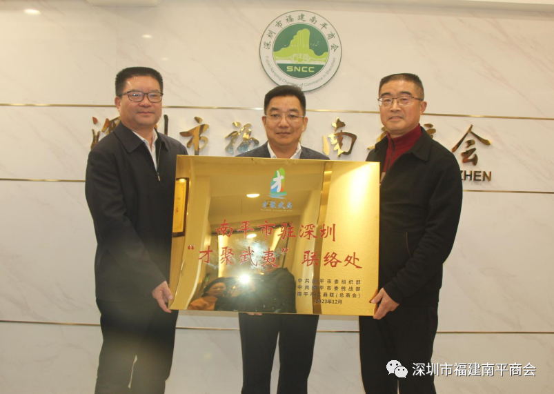 在深圳市福建南平商会办公室,在南平市人大、市政府领导以及深圳市福建南平商会领导的共同见证下,南平市人大常委会副主任兰林和、南平市人民政府副市长魏敦盛,共同为我会会长吴坤颁发了中共南平市委组织部、中共南平市委统战部、南平市工商联(总商会)共同给予的聘书,聘请吴坤会长为福建省南平市“引才大使”;同时为深圳市福建南平商会授予南平市驻深圳“才聚武夷”联络处的牌匾。