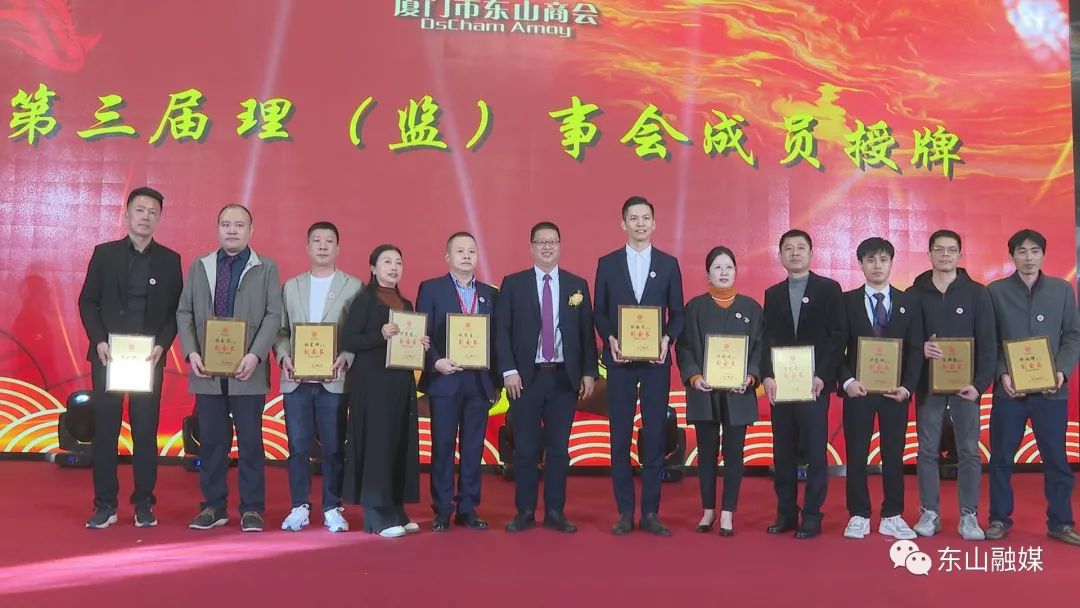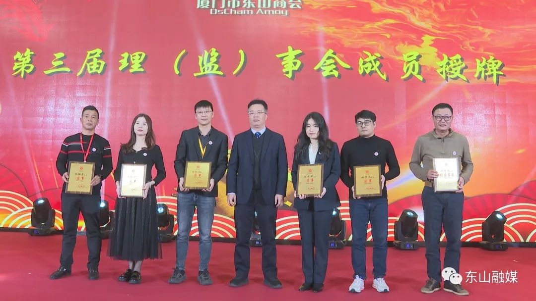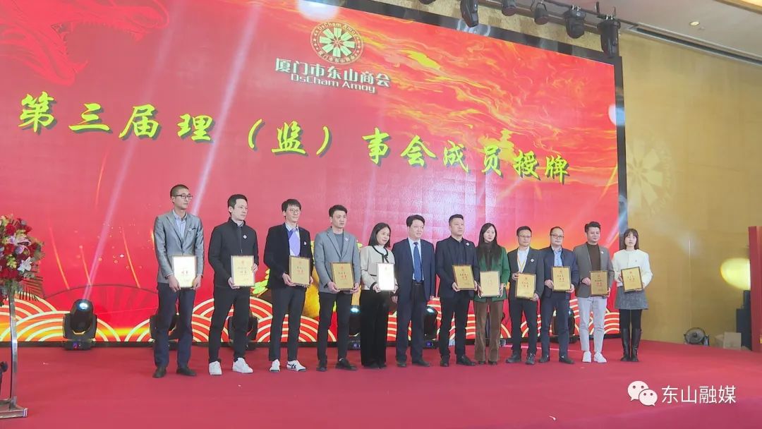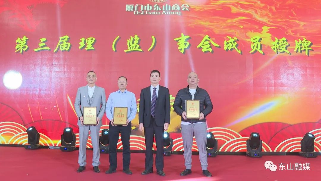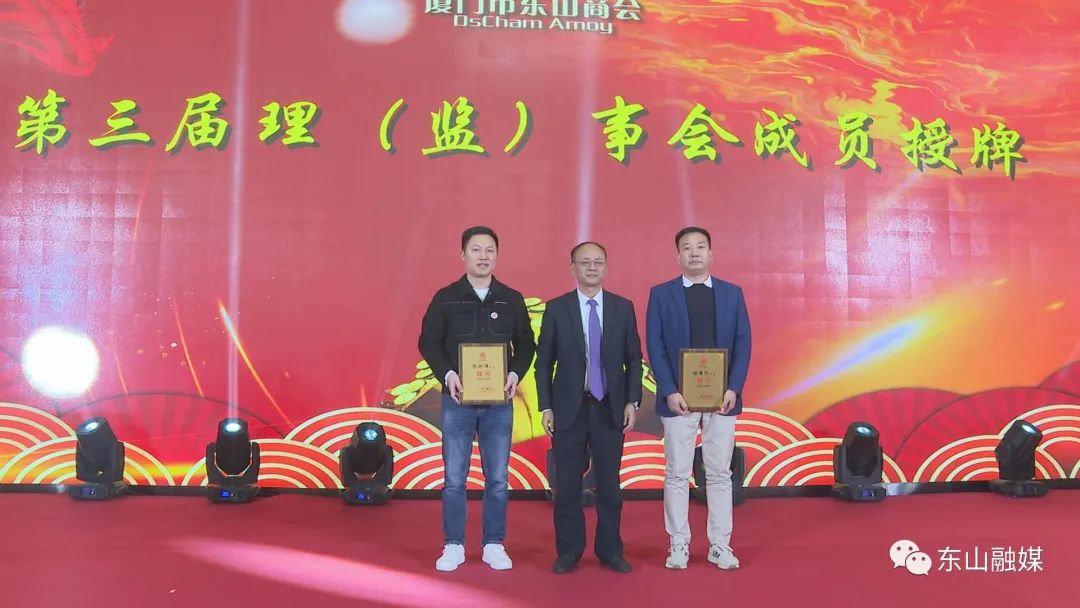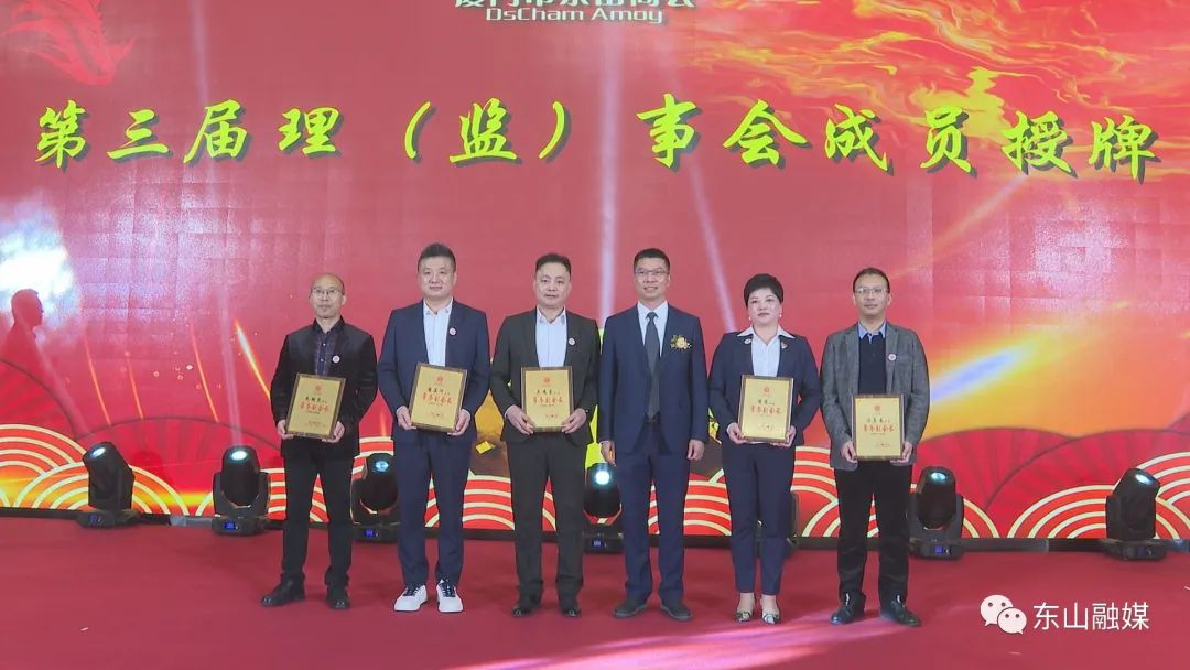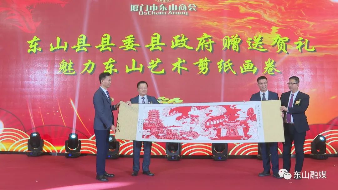 会上,县领导刘兆民、郭颖峰、周育民、张荣聪、陈良海、吴华安分别为新当选的理事会常务副会长、名誉会长、顾问、副会长、理事、监事授牌。县长刘兆民,县委常委、统战部部长郭颖峰代表县委、县政府向厦门市东山商会赠送艺术剪纸《魅力东山》。