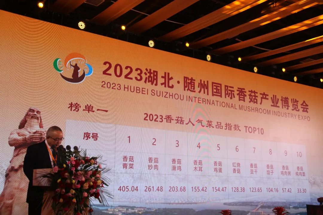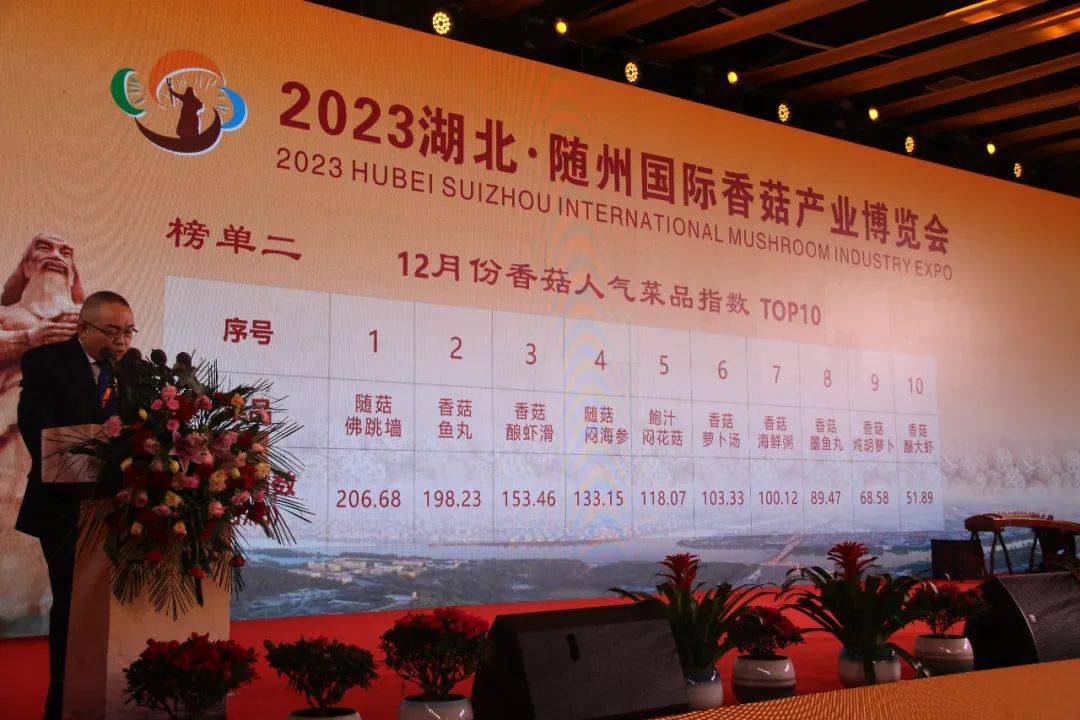 随后,中国食品土畜进出口商会秘书长刘自强公布了2023香菇菜品人气指数榜单。