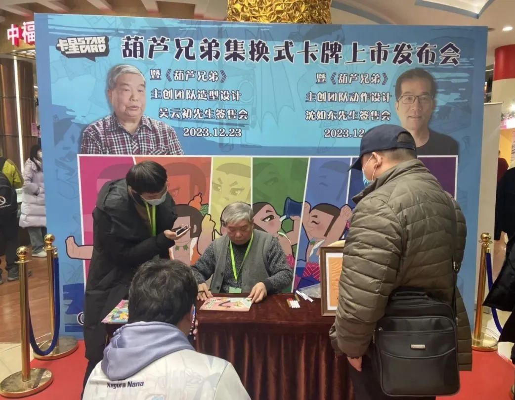 ▲卡星时代葫芦兄弟集换式卡牌上市发布会暨造型设计吴云初、动作设计沈如东签售会现场 图|坪先生从正门进入卡展现场后,映入眼帘的是卡星时代组织的葫芦兄弟集换式卡牌上市发布会暨造型设计吴云初、动作设计沈如东签售会,当天是吴云初先生签售,图中是在为收藏者在连环画上签字。在现场花299元购买一盒葫芦兄弟卡牌,就可以让设计老师在卡上进行签名,还是很值得的。