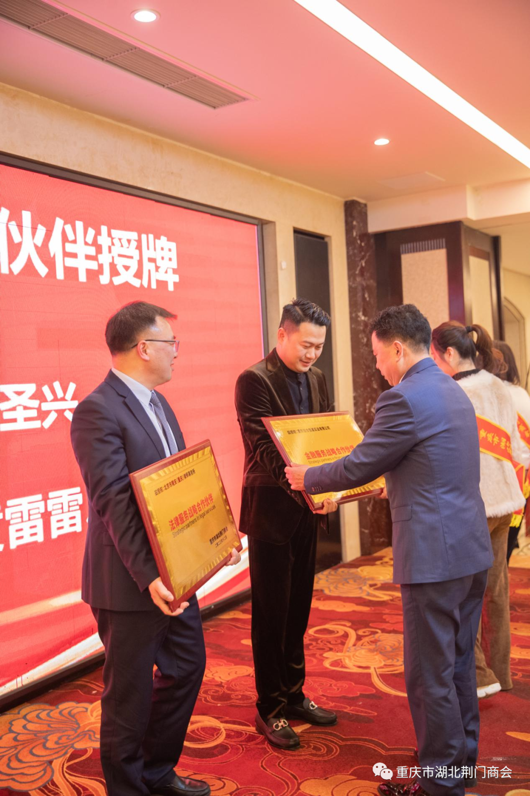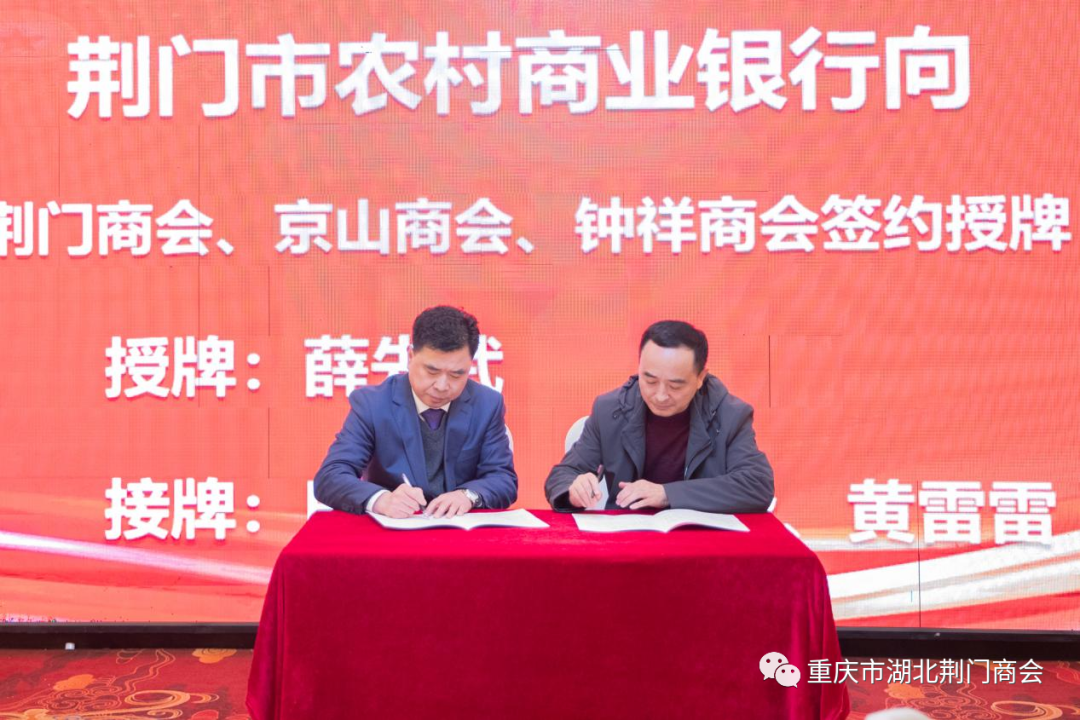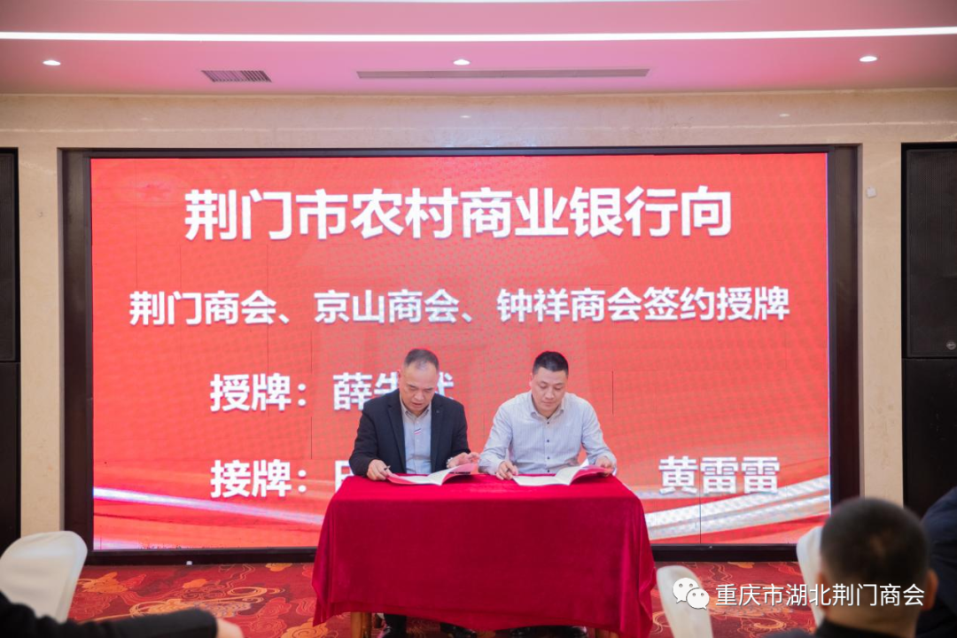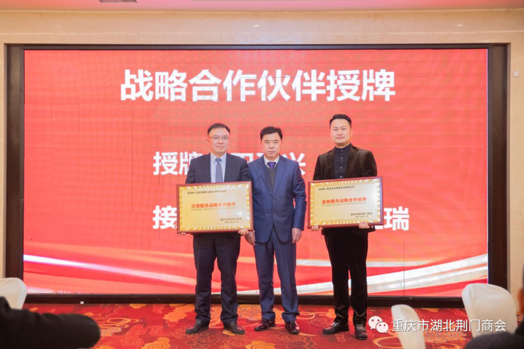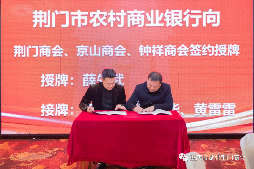 会上还举行了授牌和签署战略合作协议仪式,会长田圣兴分别向我会北京隆安(重庆)律师事务所、重庆市钛和恒基实业有限公司授牌,成为我会战略合作伙伴单位,更好的为会员服务。湖北省荆门市农村商业银行副行长薛先武、京山市农村商业银行副行长肖永华、钟祥市农村商业银行副行长全以军分别与重庆市湖北荆门商会、京山商会、钟祥商会签署战略合作协议并授牌、授信,我会会长田圣兴、常务副会长许贤华、副会长黄雷雷代表三家商会签字、接牌。薛先武副行长发表了重要讲话,京山市农村商业银行信贷管理部负责人胡璠对农村商业银行微贷产品作了宣讲。